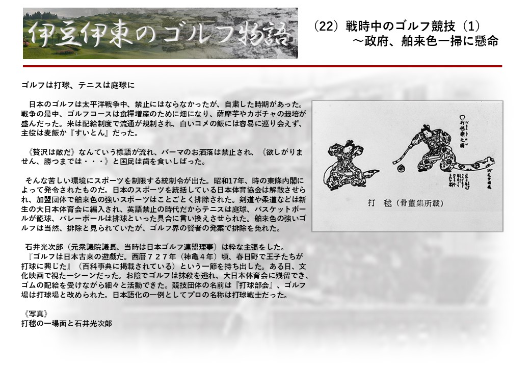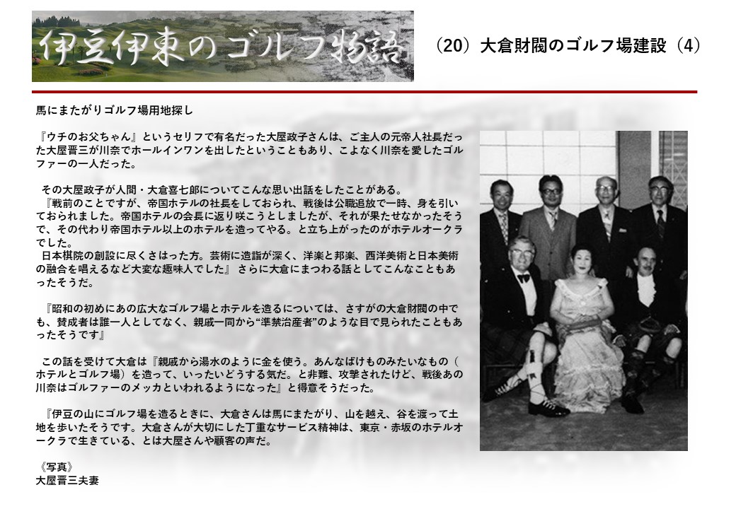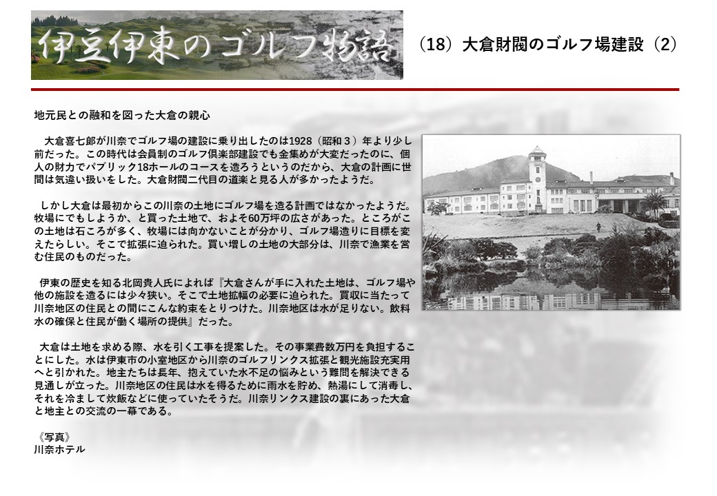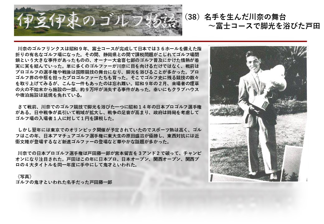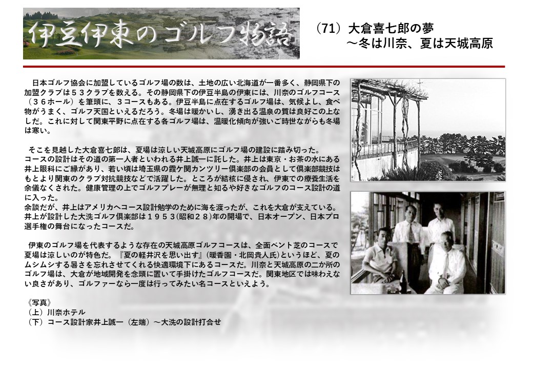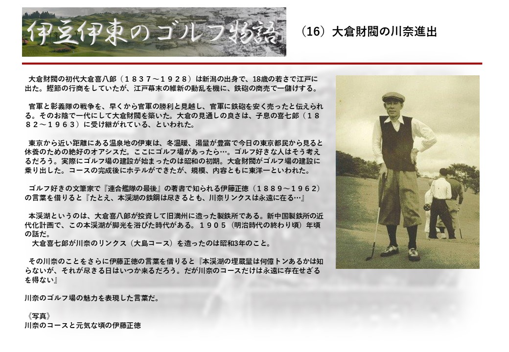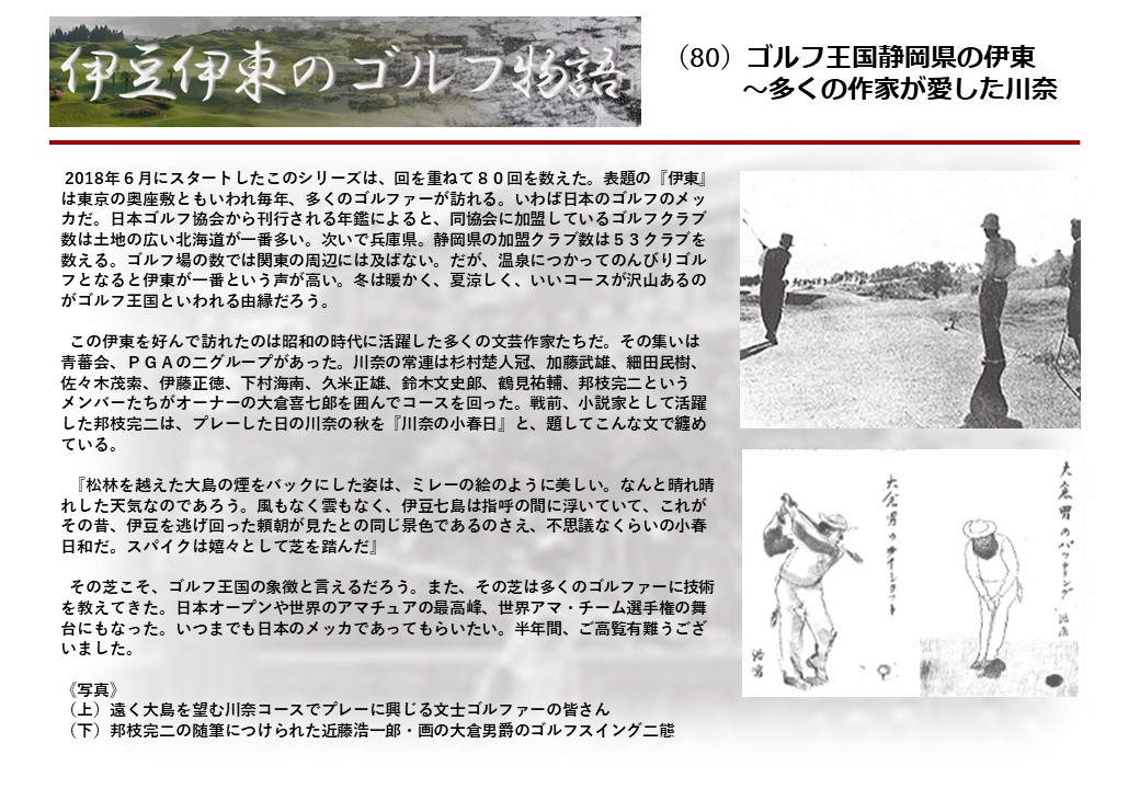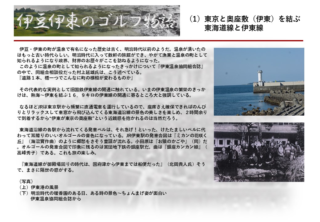 この伊東には古くから東洋一といわれたリゾートホテルがあり、36ホールの名コースもある。戦後には伊東市を中心に多くのゴルフコースが建設され、大勢のゴルファ―が訪れるようになり、日本のゴルフは伊東で育てられた一面もある。