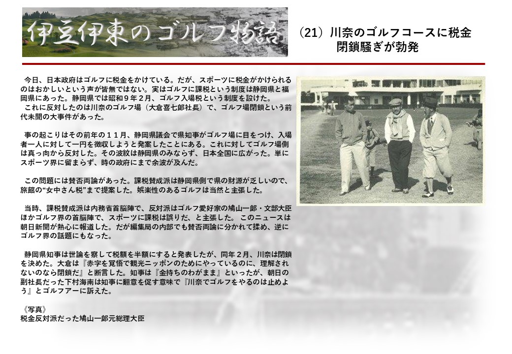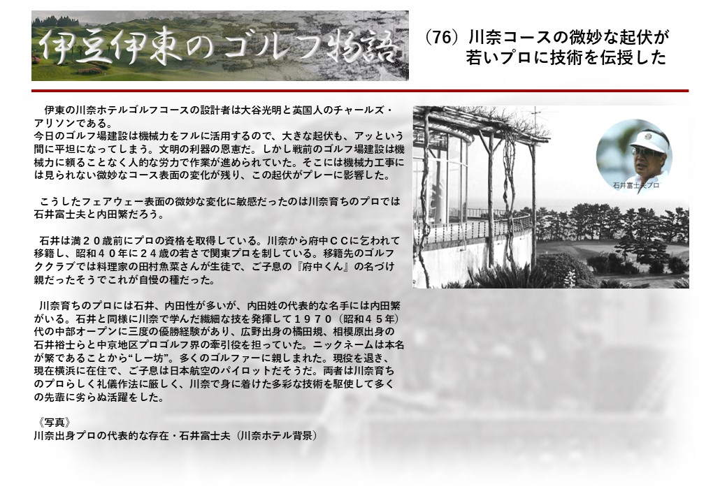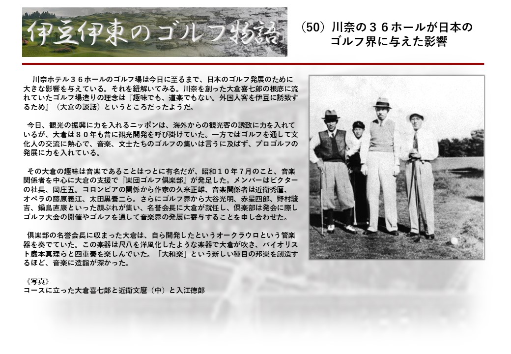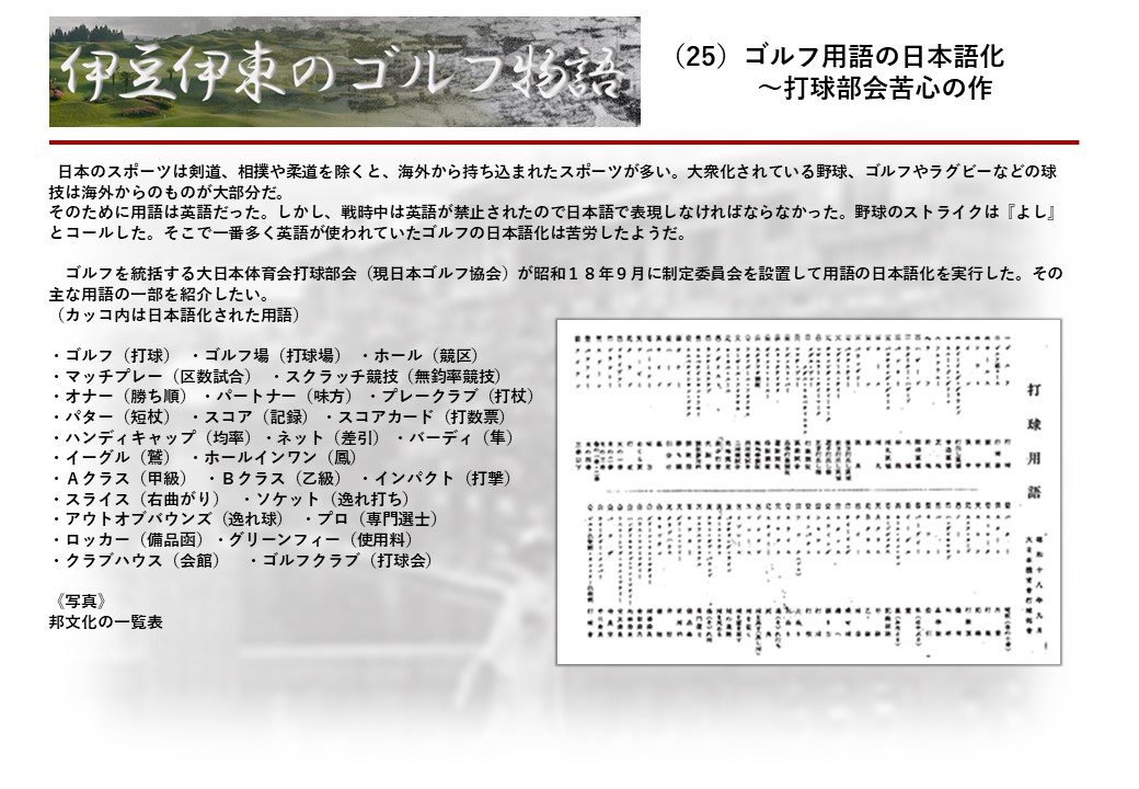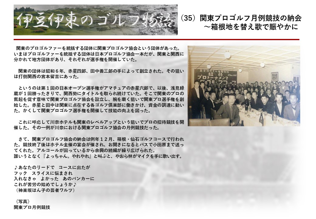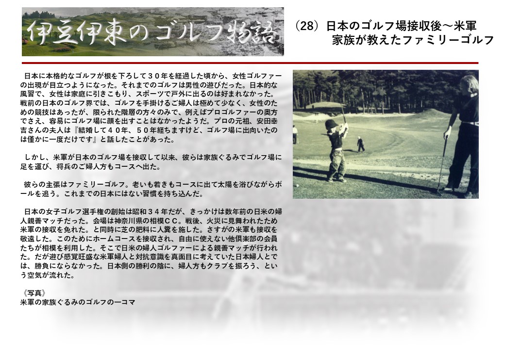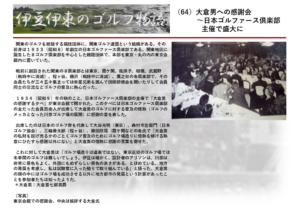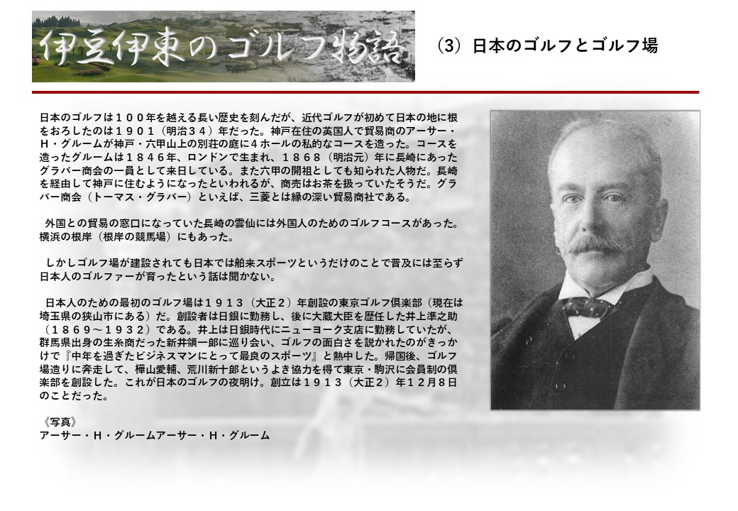 この伊東には古くから東洋一といわれたリゾートホテルがあり、36ホールの名コースもある。戦後には伊東市を中心に多くのゴルフコースが建設され、大勢のゴルファ―が訪れるようになり、日本のゴルフは伊東で育てられた一面もある。