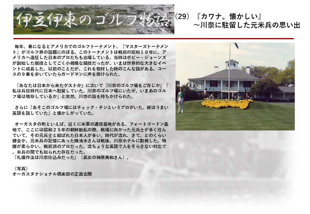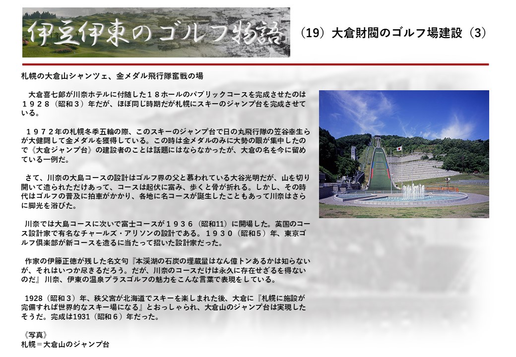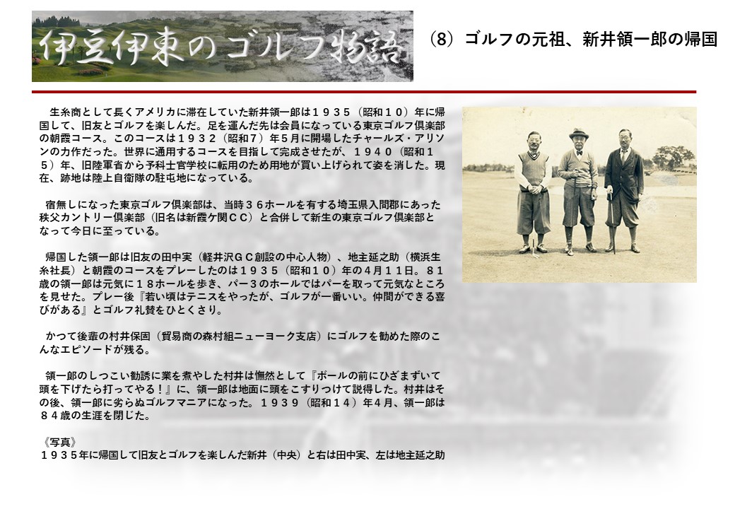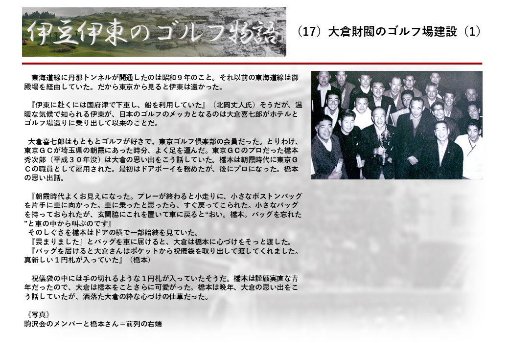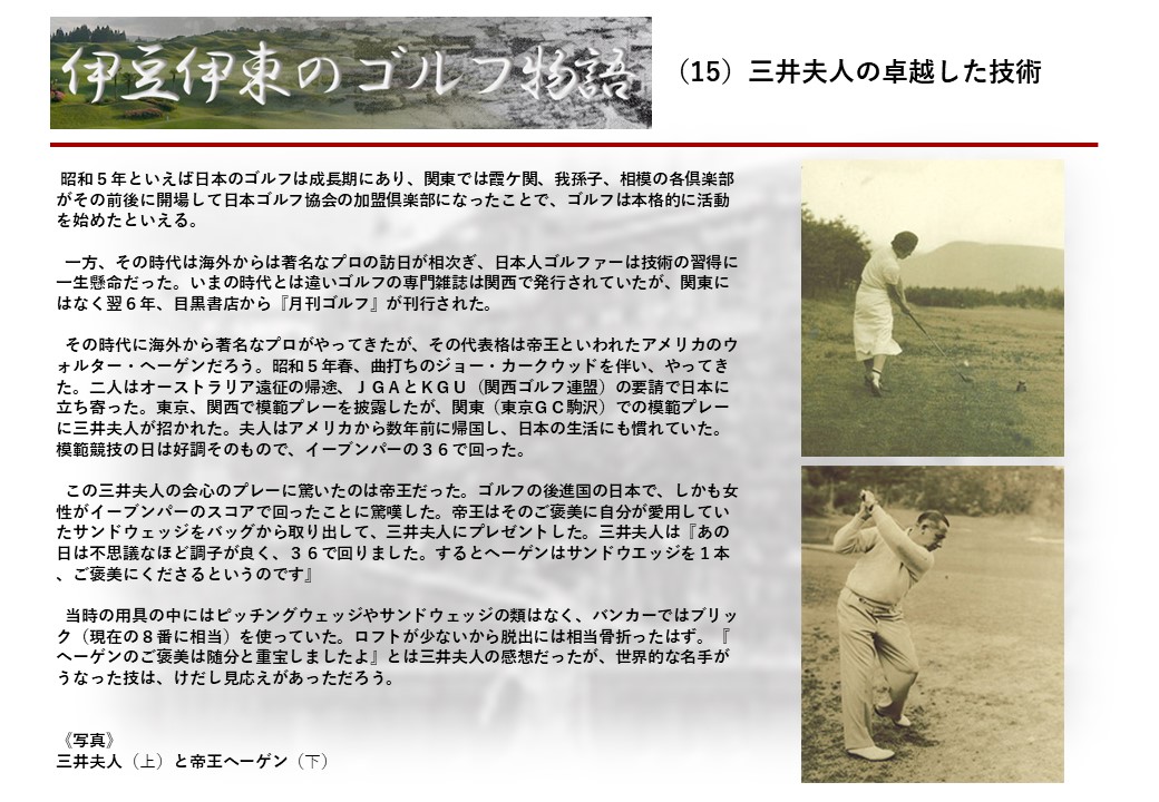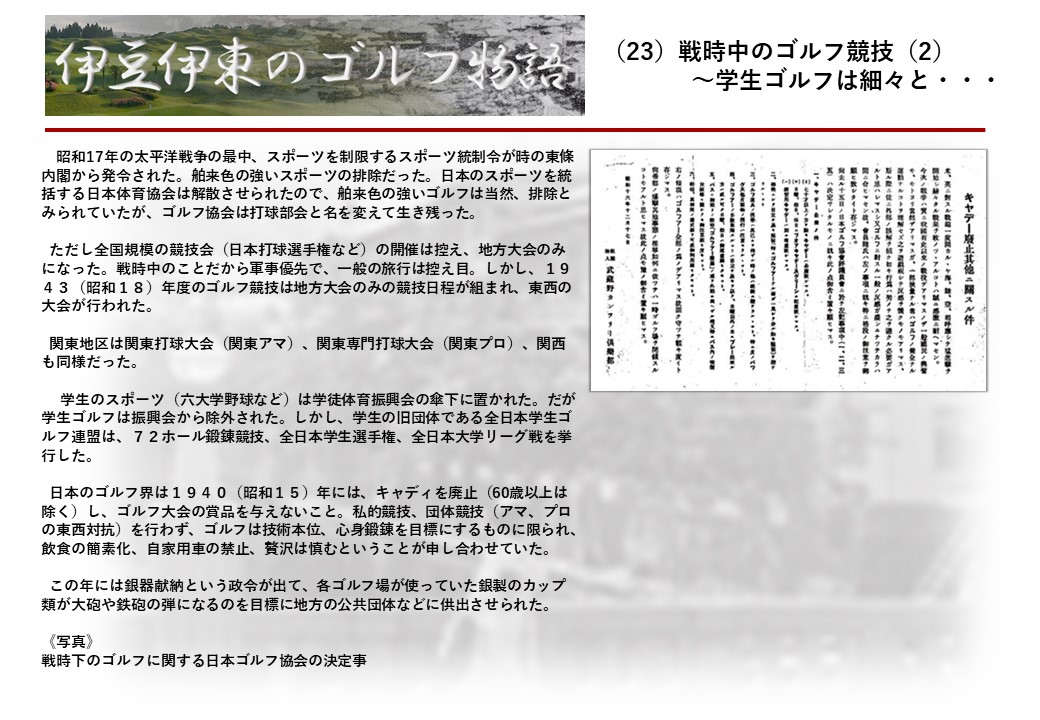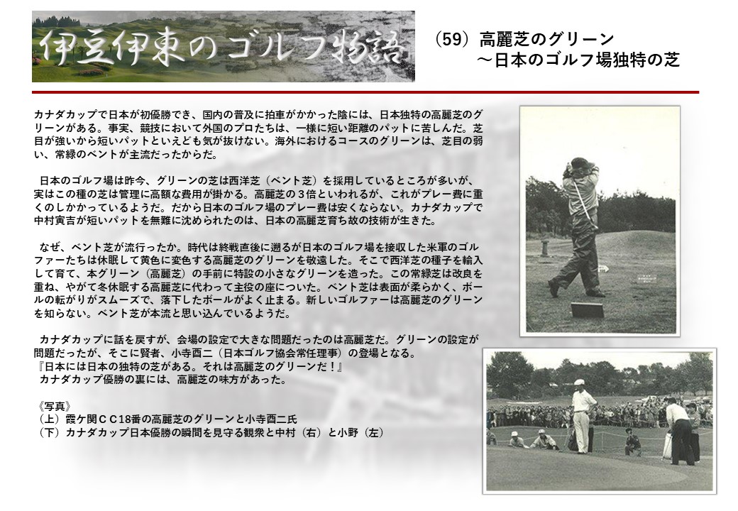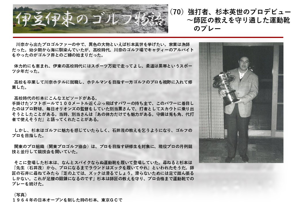 この伊東には古くから東洋一といわれたリゾートホテルがあり、36ホールの名コースもある。戦後には伊東市を中心に多くのゴルフコースが建設され、大勢のゴルファ―が訪れるようになり、日本のゴルフは伊東で育てられた一面もある。