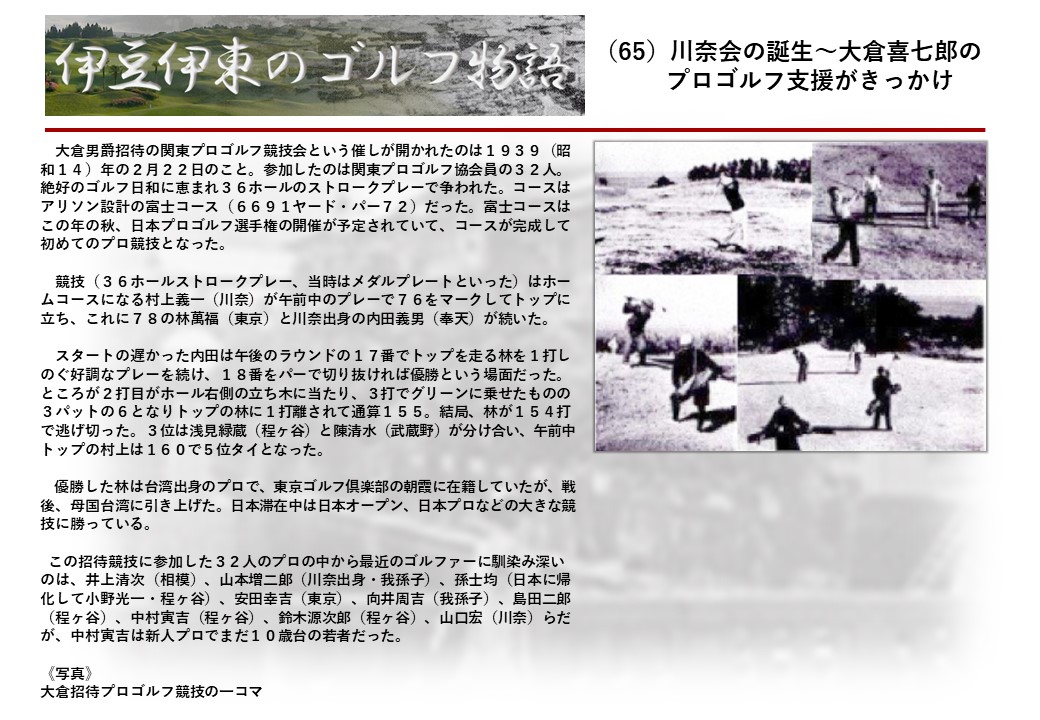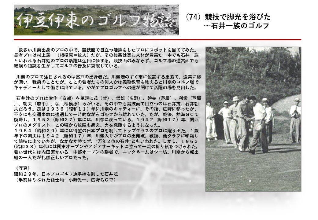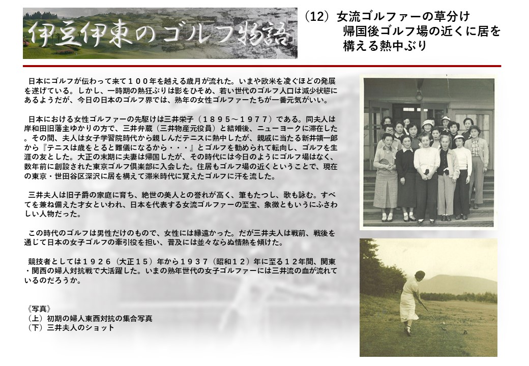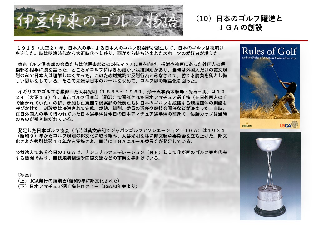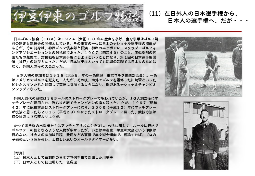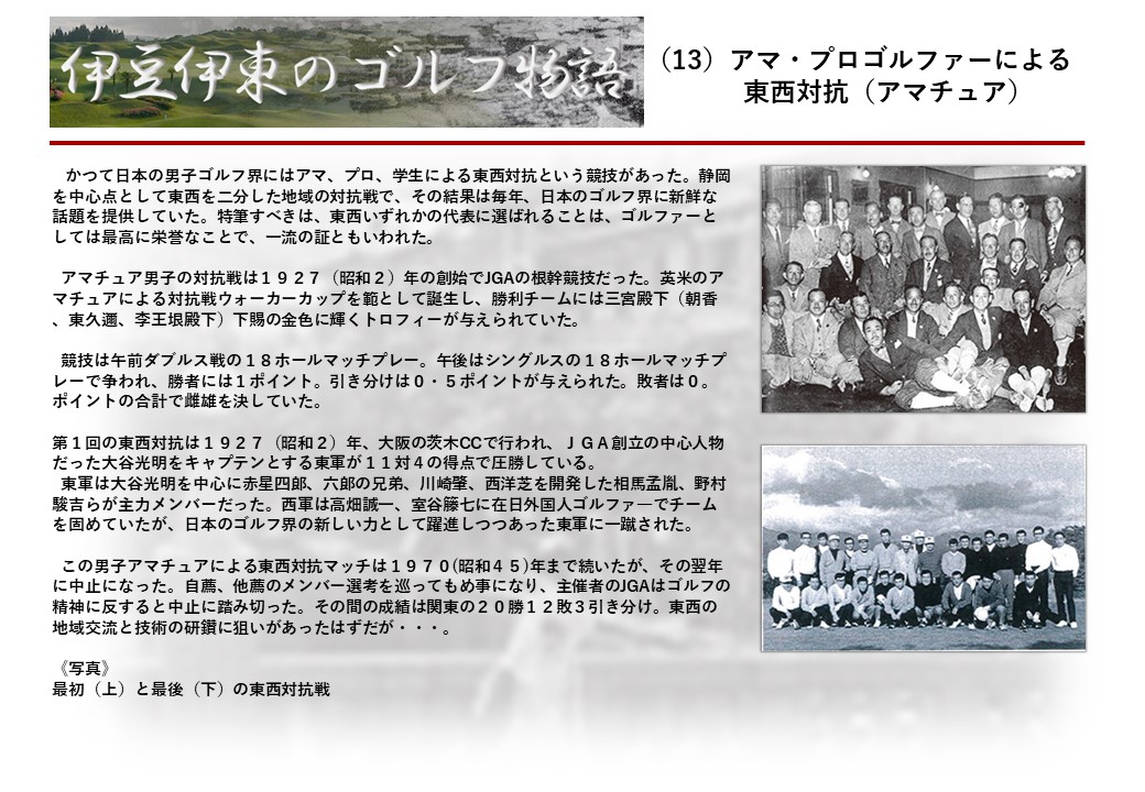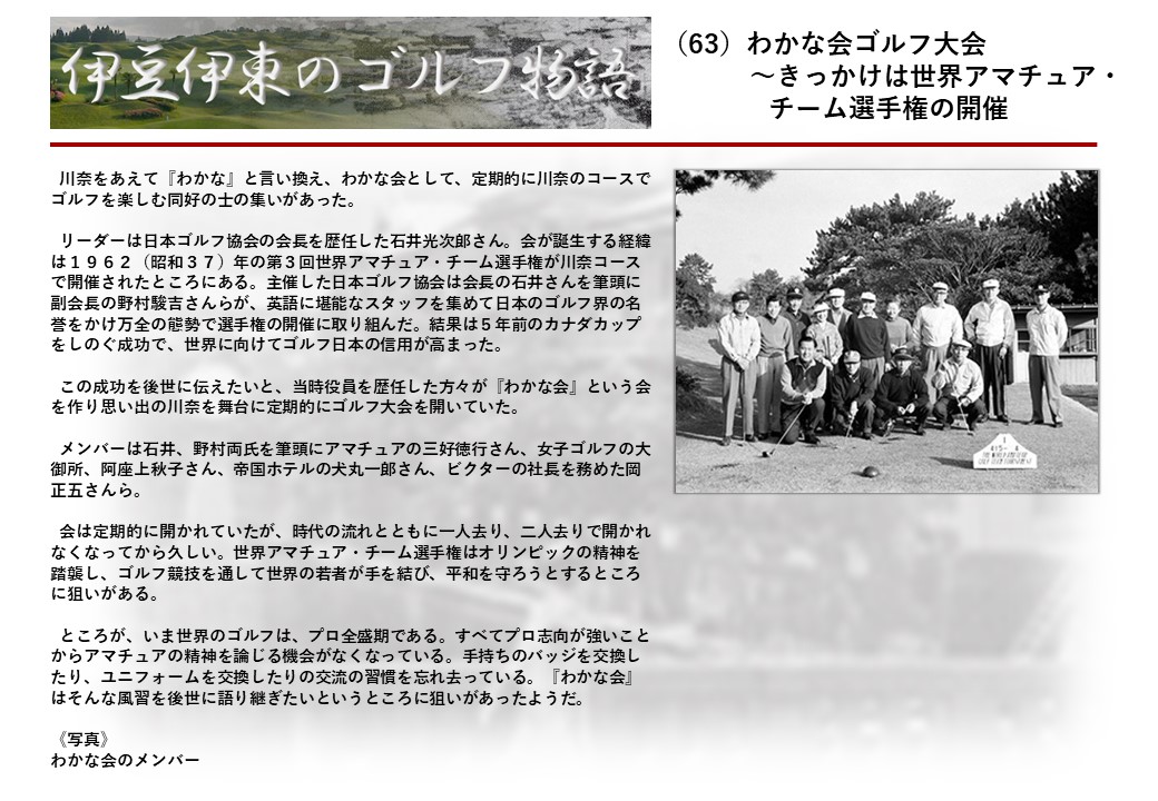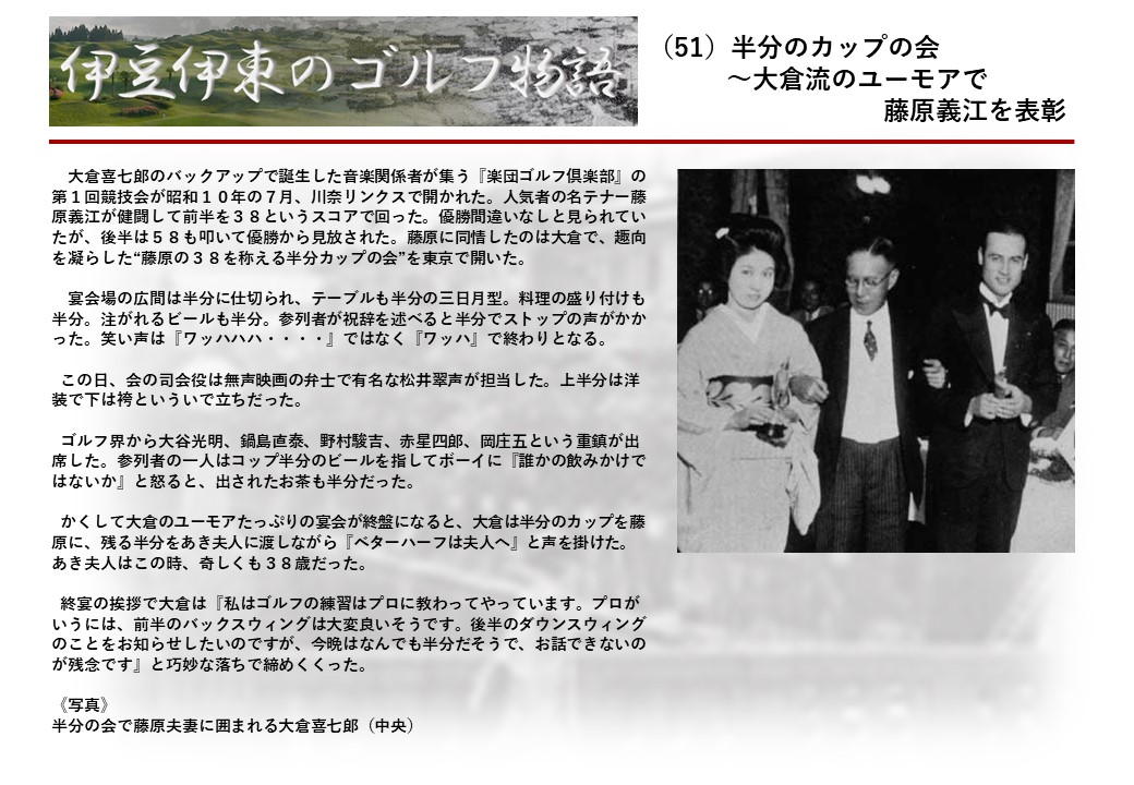 この伊東には古くから東洋一といわれたリゾートホテルがあり、36ホールの名コースもある。戦後には伊東市を中心に多くのゴルフコースが建設され、大勢のゴルファ―が訪れるようになり、日本のゴルフは伊東で育てられた一面もある。