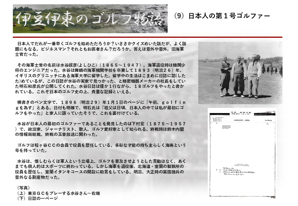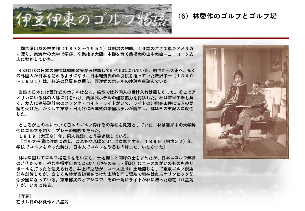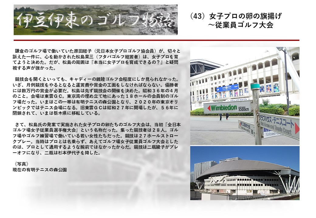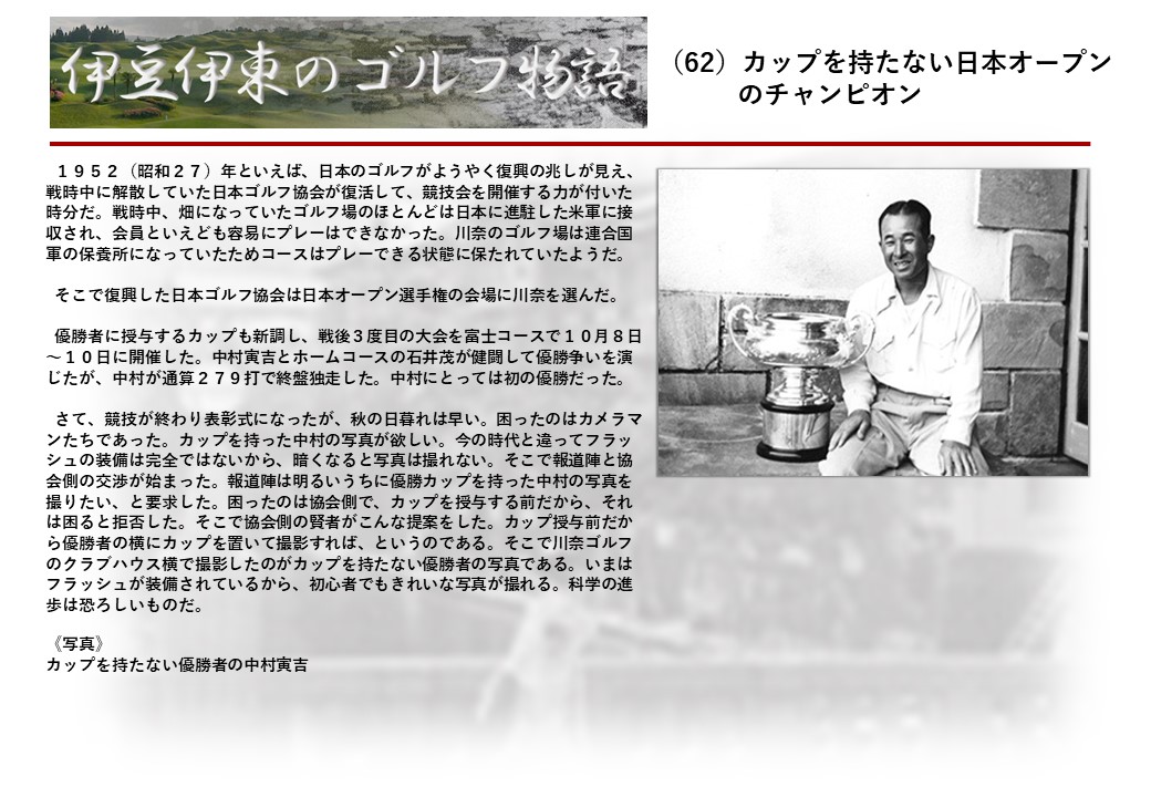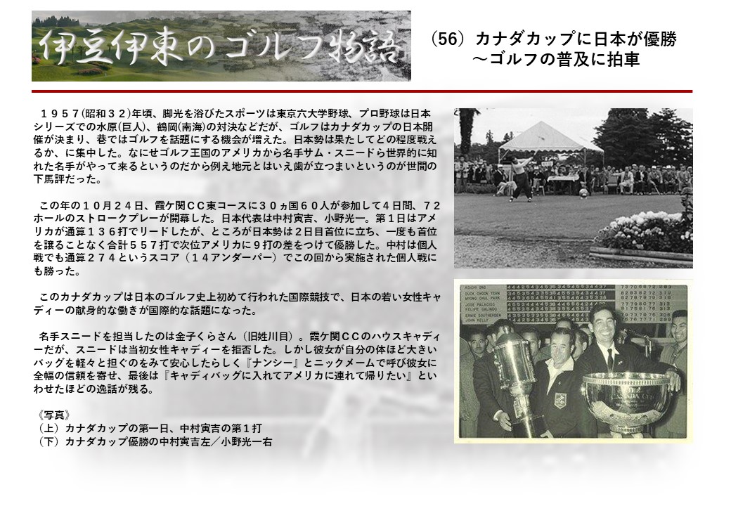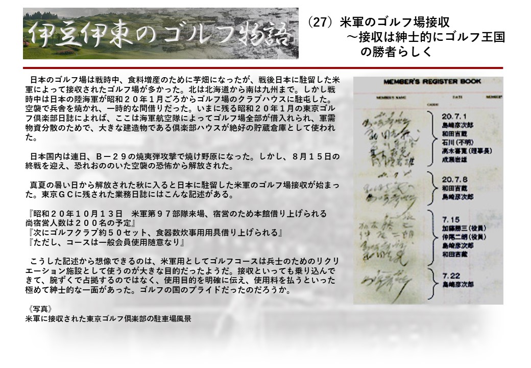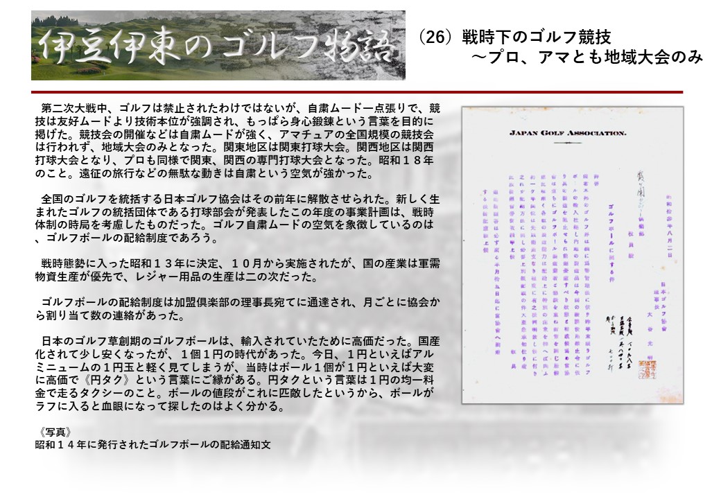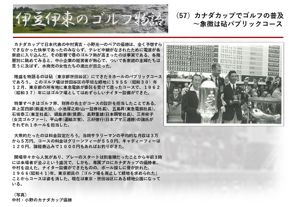 この伊東には古くから東洋一といわれたリゾートホテルがあり、36ホールの名コースもある。戦後には伊東市を中心に多くのゴルフコースが建設され、大勢のゴルファ―が訪れるようになり、日本のゴルフは伊東で育てられた一面もある。