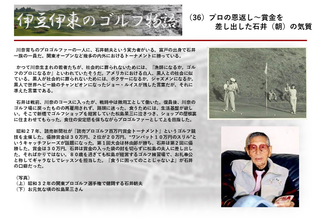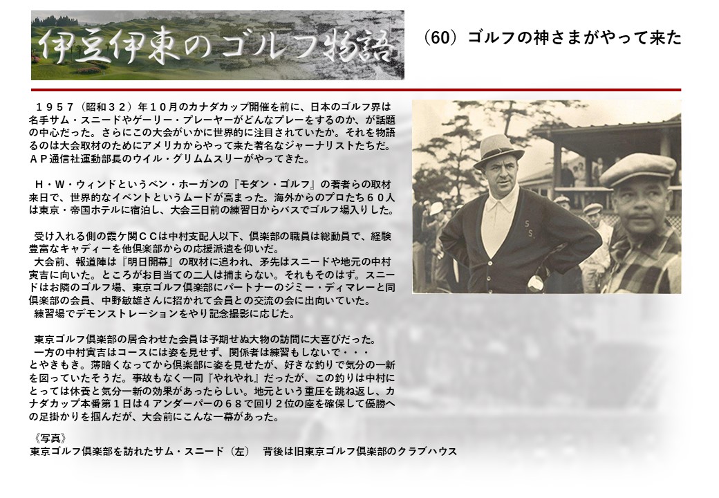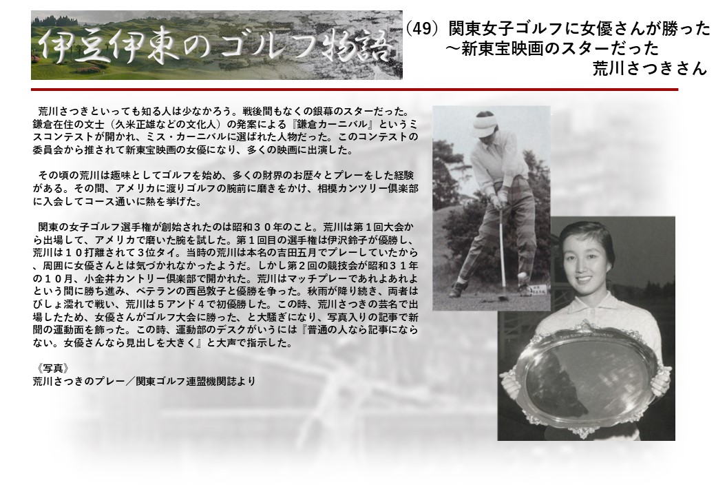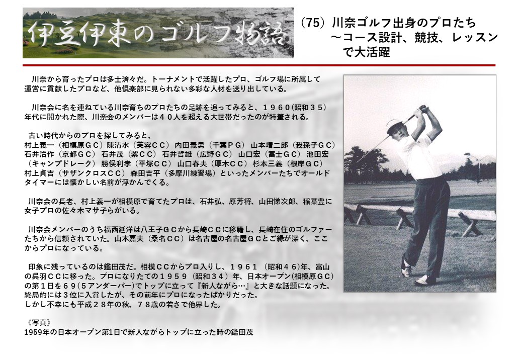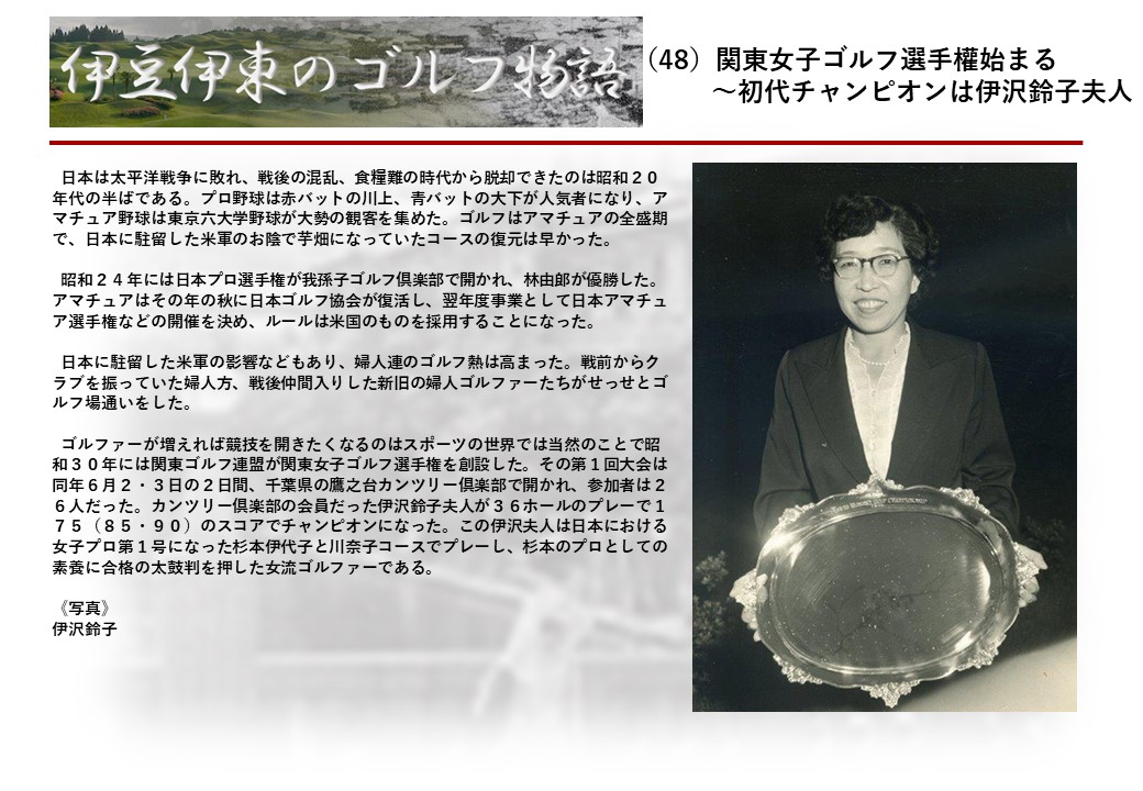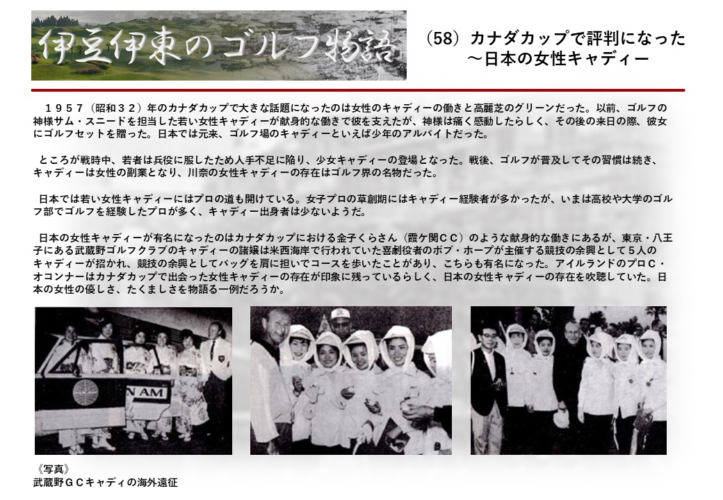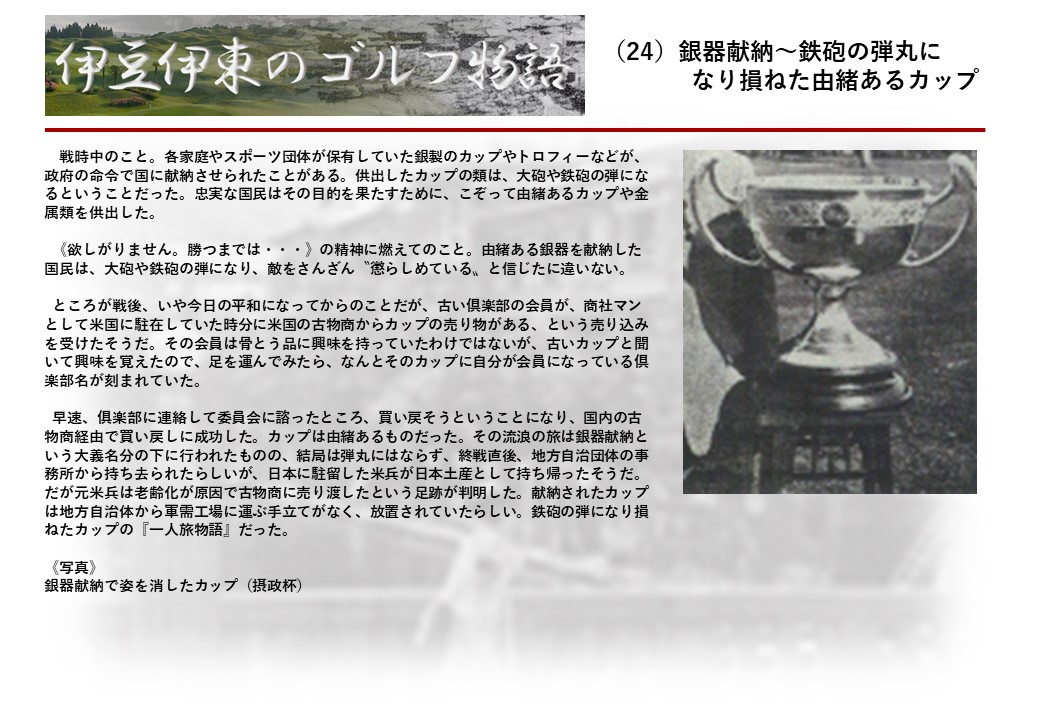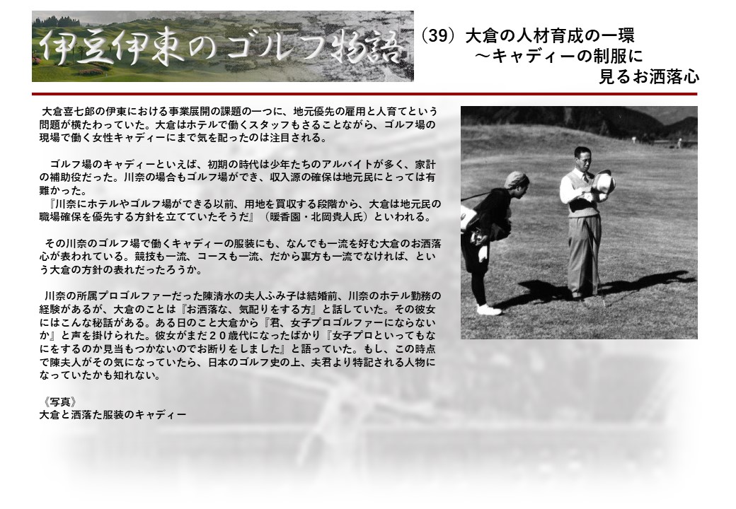 この伊東には古くから東洋一といわれたリゾートホテルがあり、36ホールの名コースもある。戦後には伊東市を中心に多くのゴルフコースが建設され、大勢のゴルファ―が訪れるようになり、日本のゴルフは伊東で育てられた一面もある。