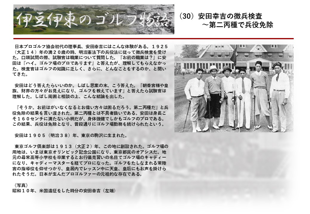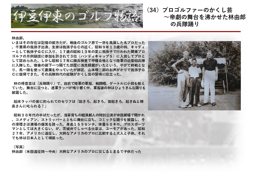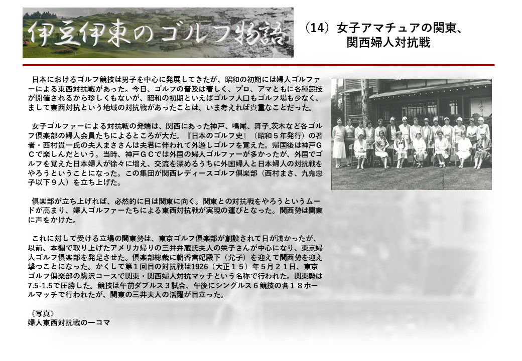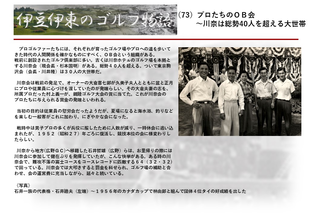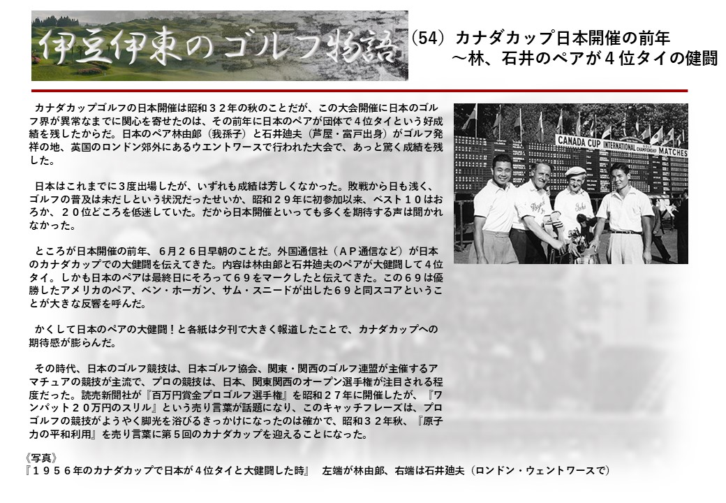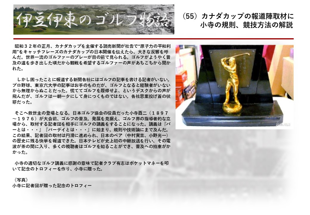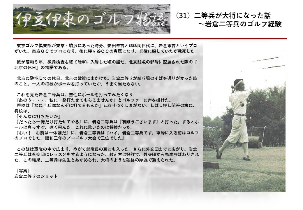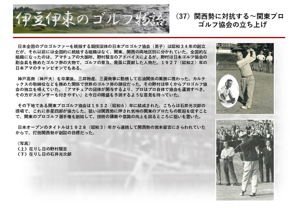 この伊東には古くから東洋一といわれたリゾートホテルがあり、36ホールの名コースもある。戦後には伊東市を中心に多くのゴルフコースが建設され、大勢のゴルファ―が訪れるようになり、日本のゴルフは伊東で育てられた一面もある。