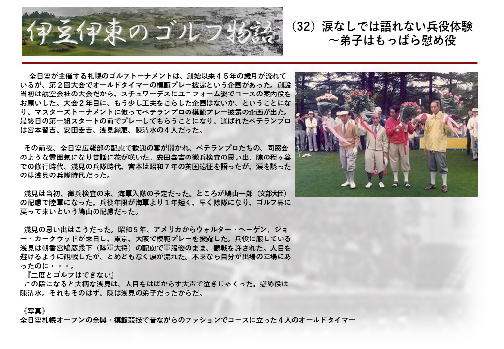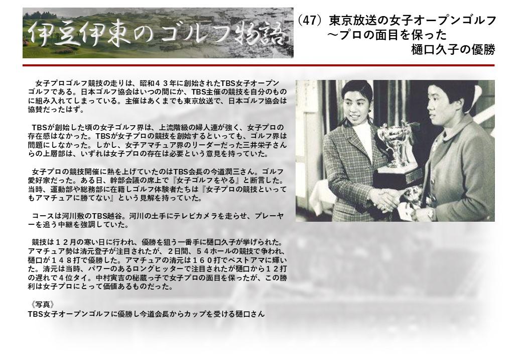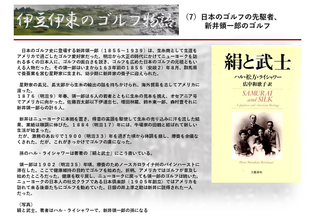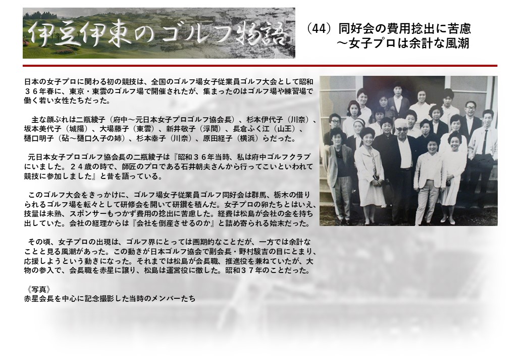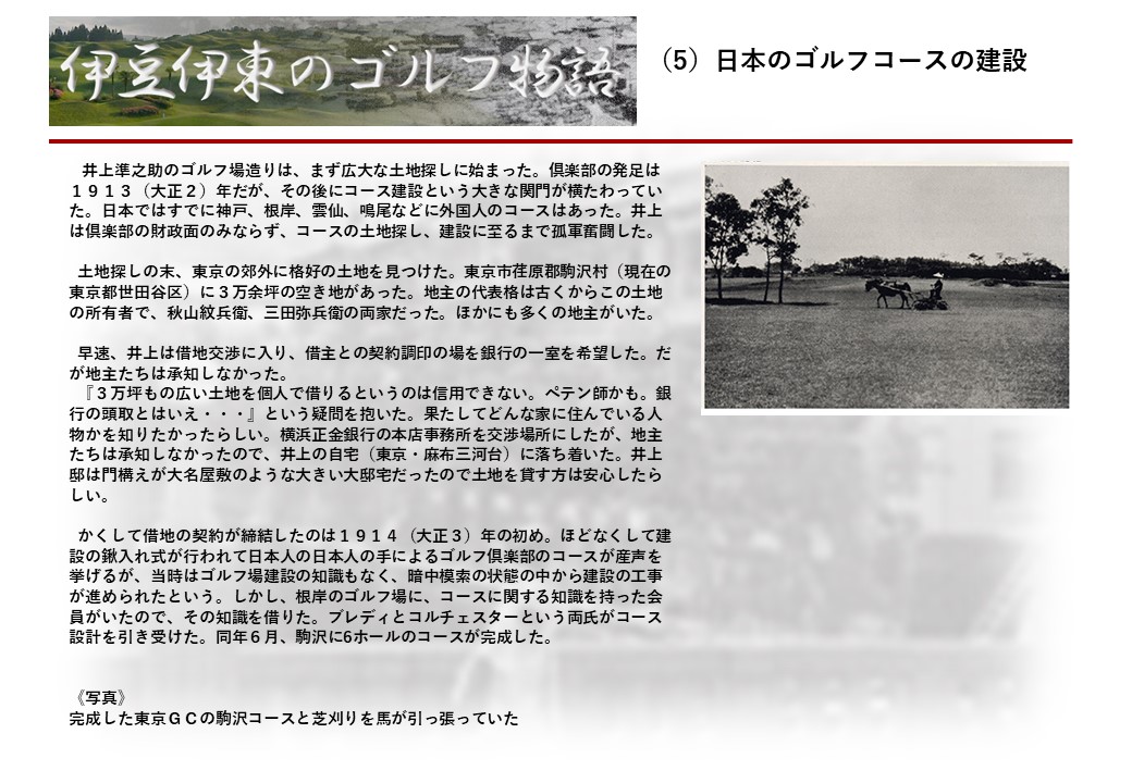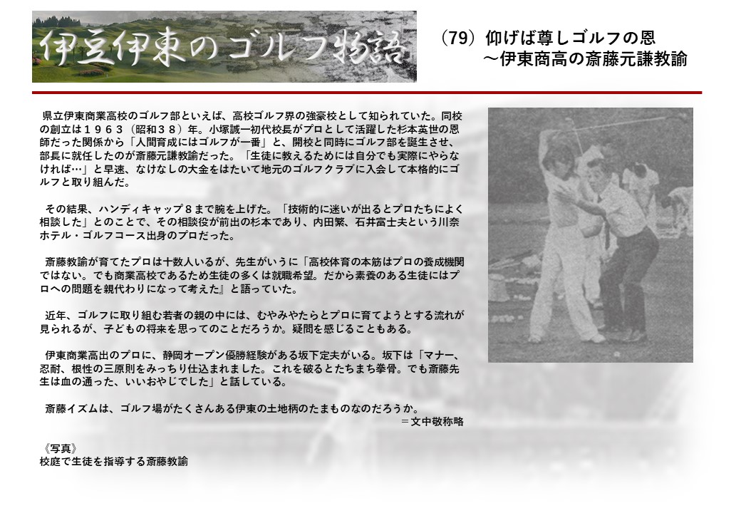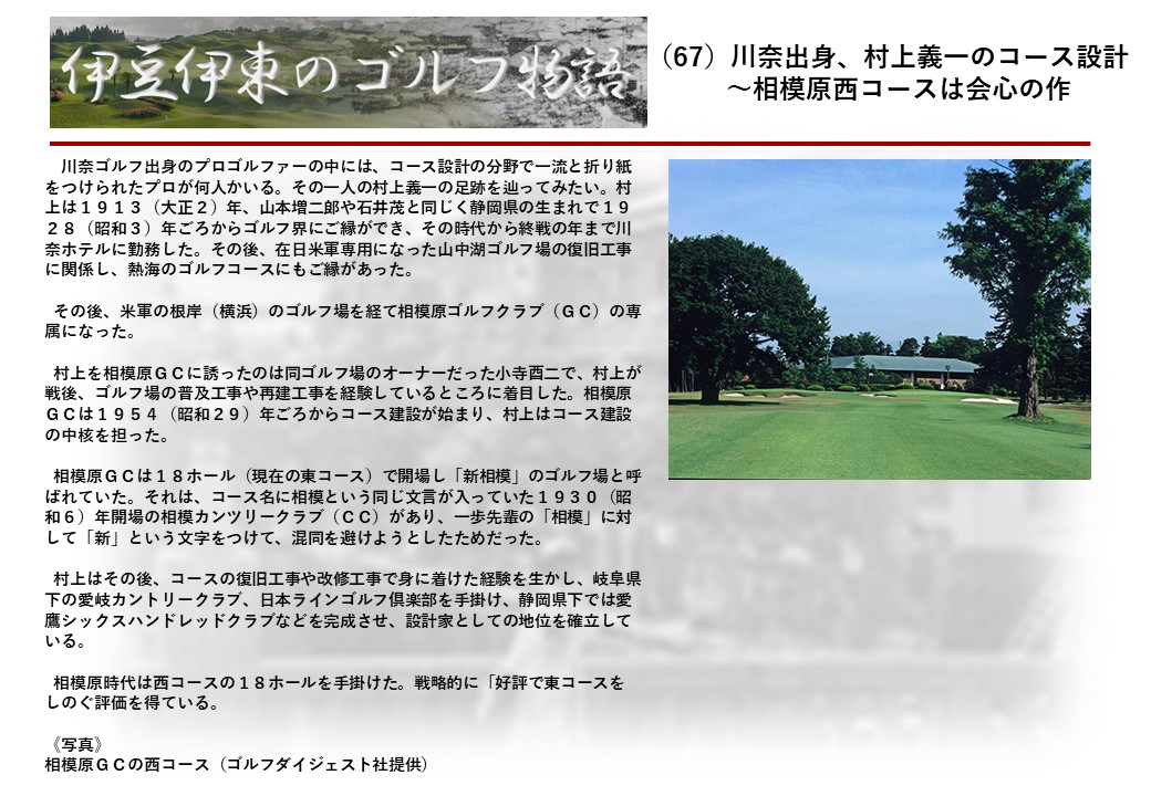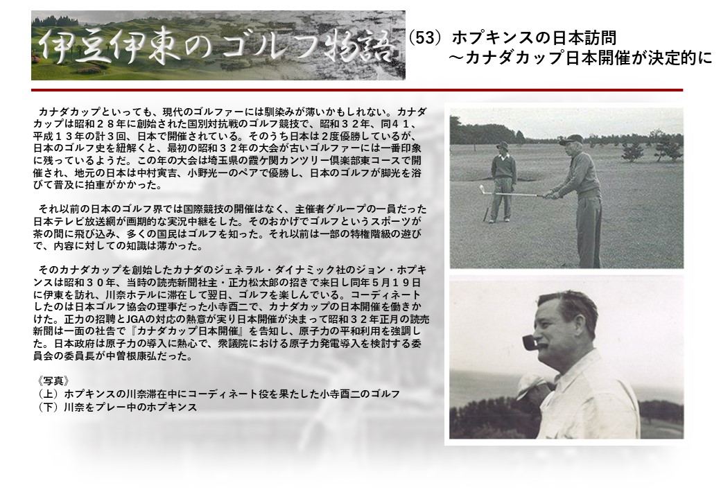 この伊東には古くから東洋一といわれたリゾートホテルがあり、36ホールの名コースもある。戦後には伊東市を中心に多くのゴルフコースが建設され、大勢のゴルファ―が訪れるようになり、日本のゴルフは伊東で育てられた一面もある。