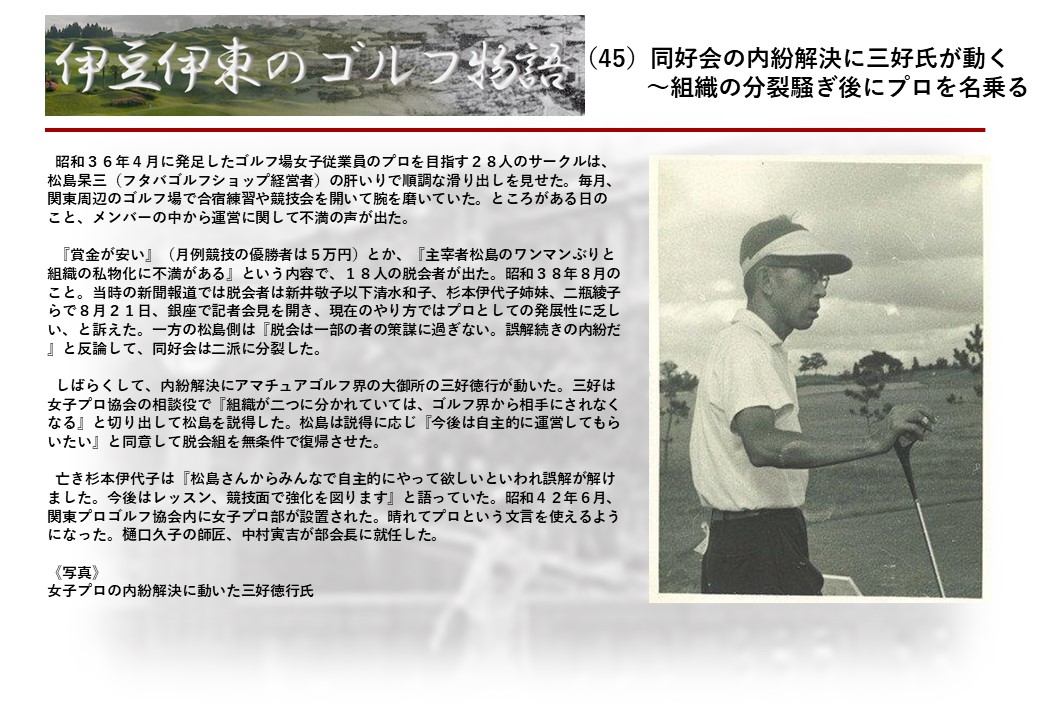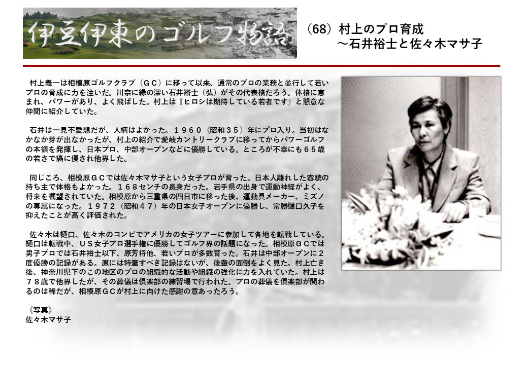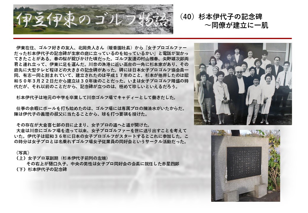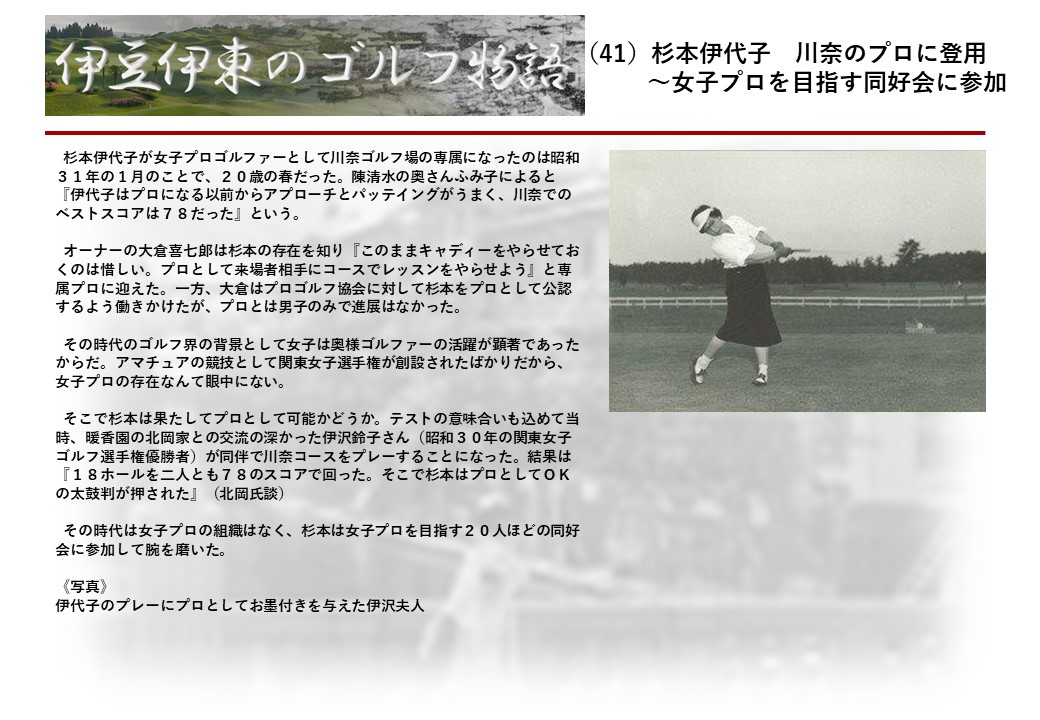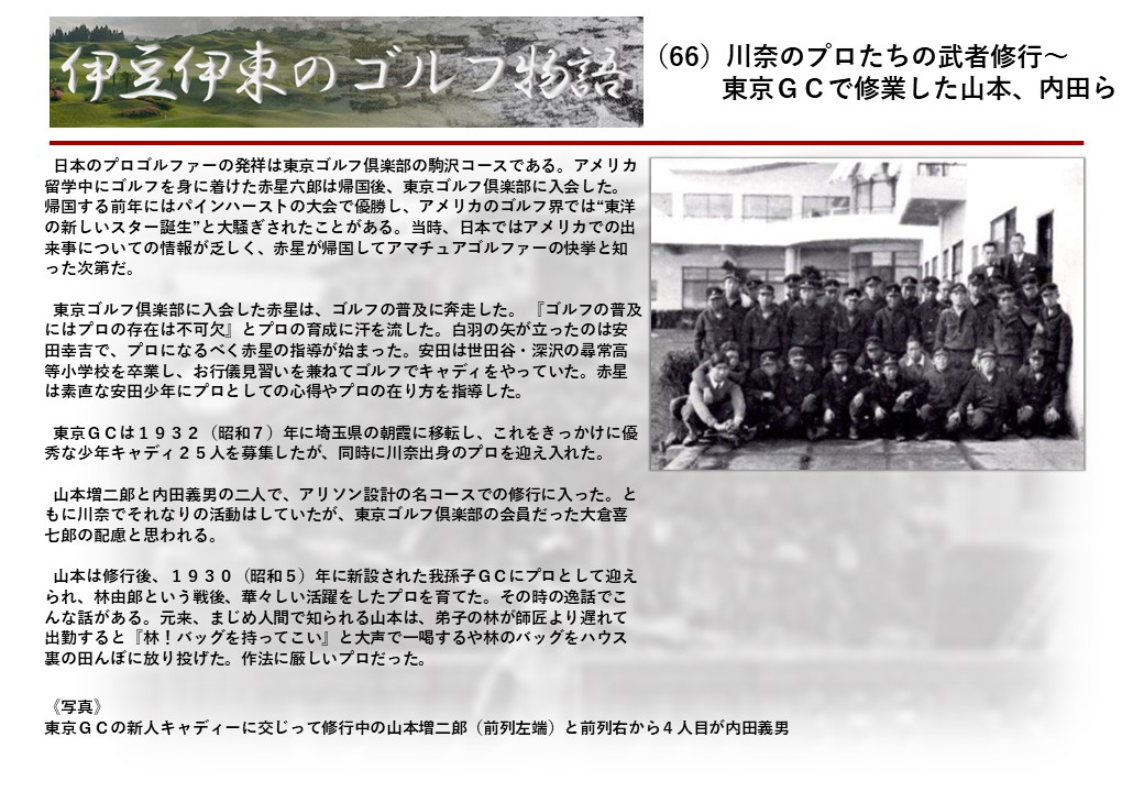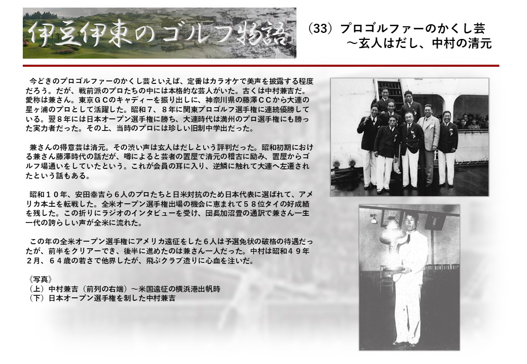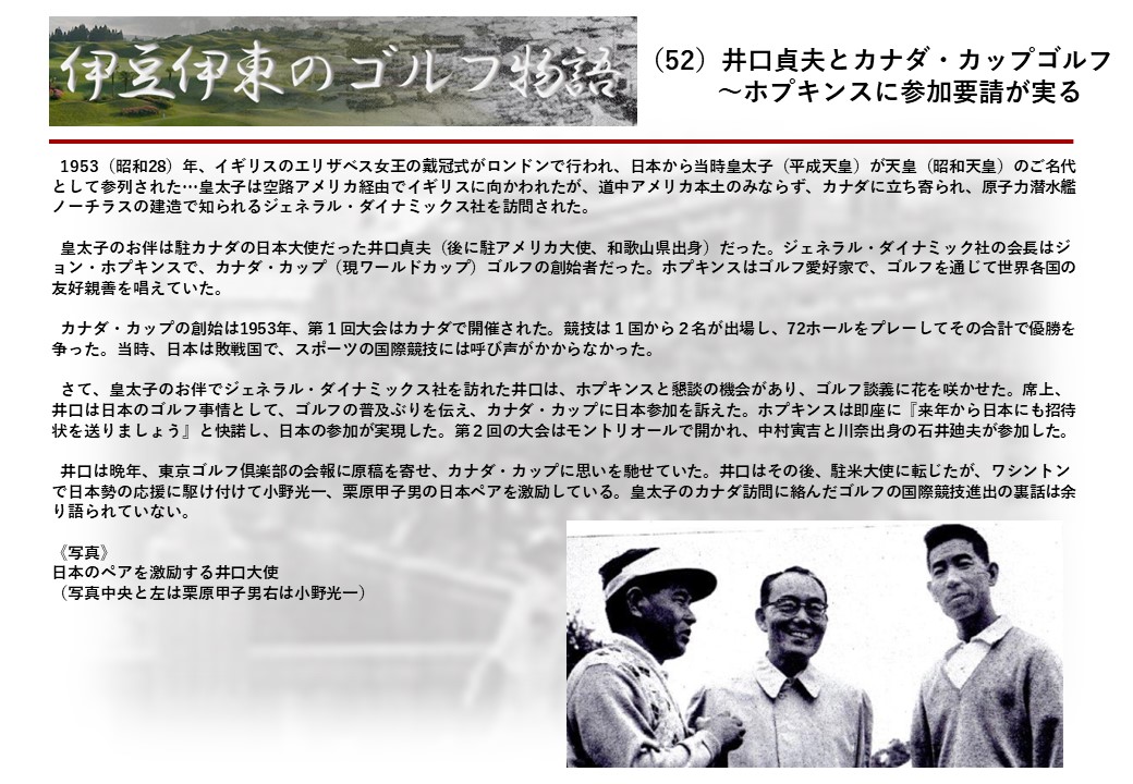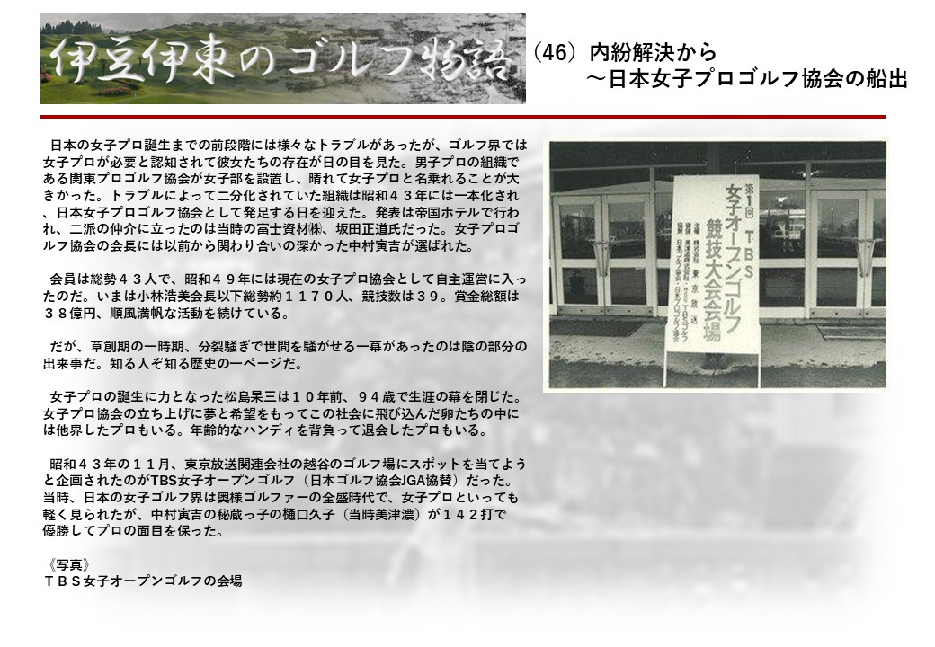 この伊東には古くから東洋一といわれたリゾートホテルがあり、36ホールの名コースもある。戦後には伊東市を中心に多くのゴルフコースが建設され、大勢のゴルファ―が訪れるようになり、日本のゴルフは伊東で育てられた一面もある。