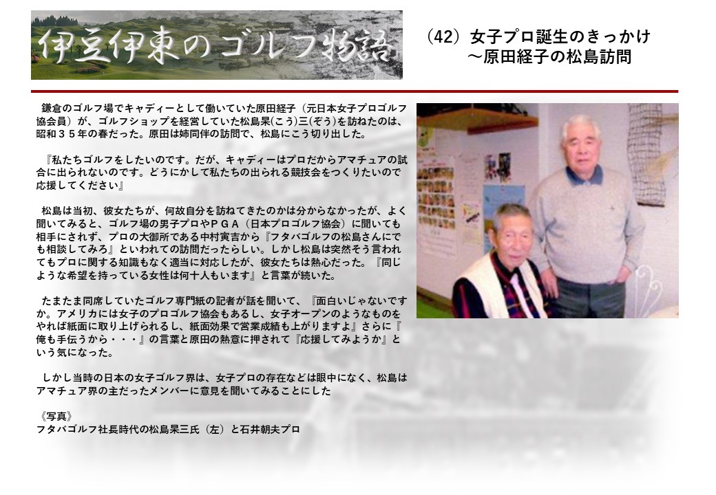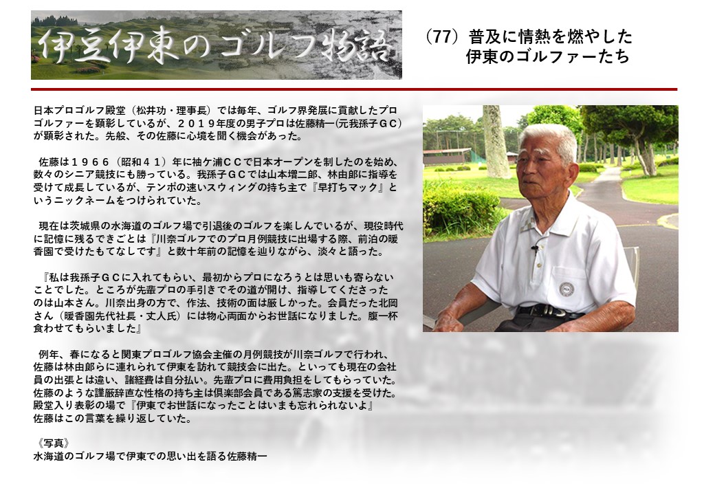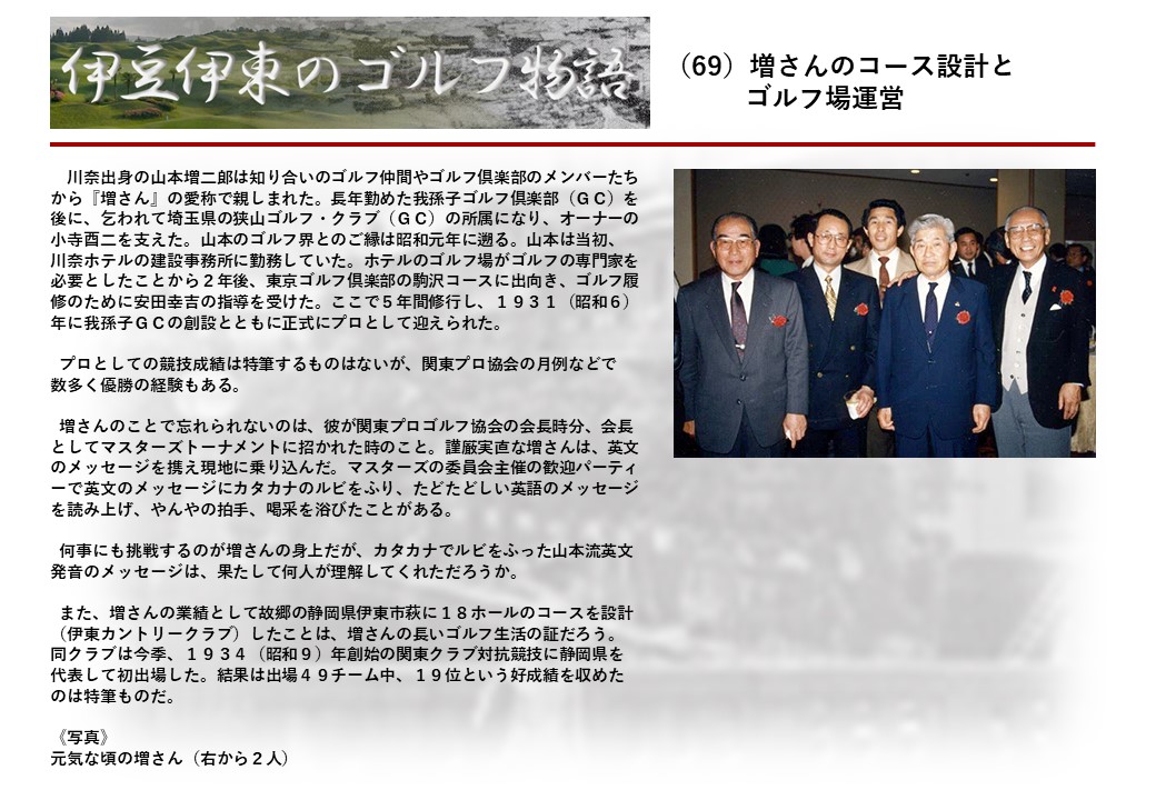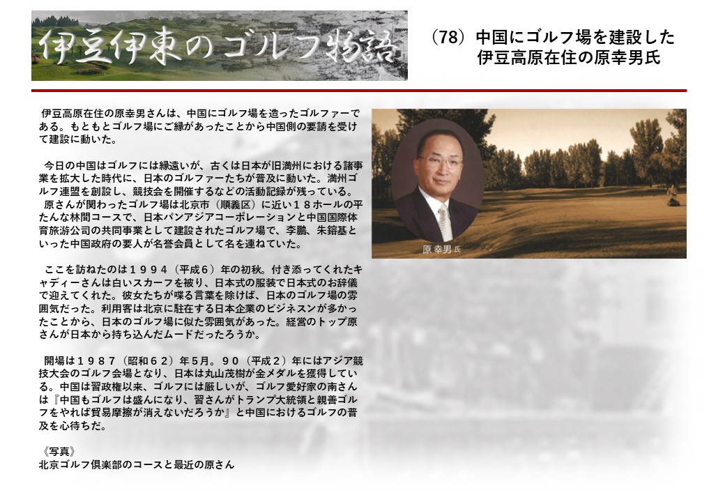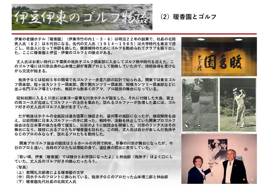 明治22年創業の老舗ホテル『暖香園』の6代目社長の北岡貴人氏(82)は、幼少期からゴルフに親しみ学生時代には関東学生ゴルフ選手権に優勝した名ゴルファーだ。その北岡氏は『日本のゴルフは100年の歴史を刻んだ。ここ伊東を舞台にして多くのゴルファーも育っている。伊東にまつわるゴルフ史とこれにかけた先人の苦闘を後世に残したい』という発想を踏み台に『伊豆・伊東のゴルフ物語』の連載を進めることにした。