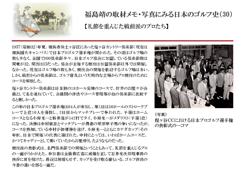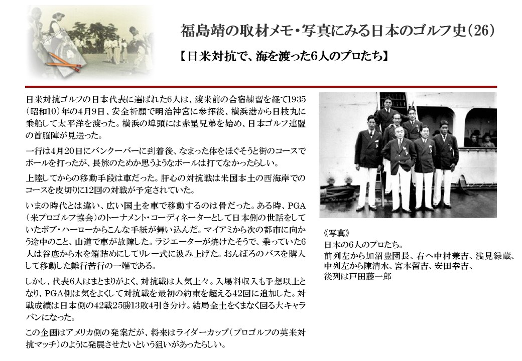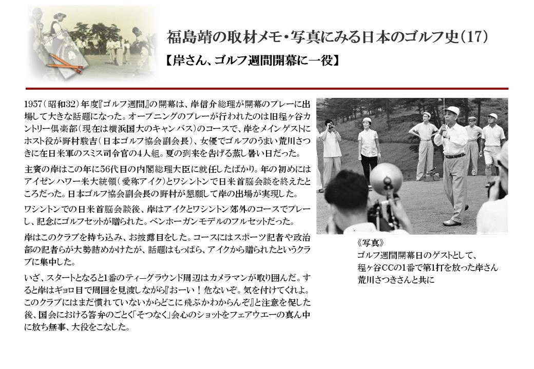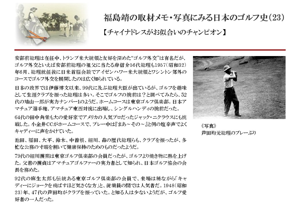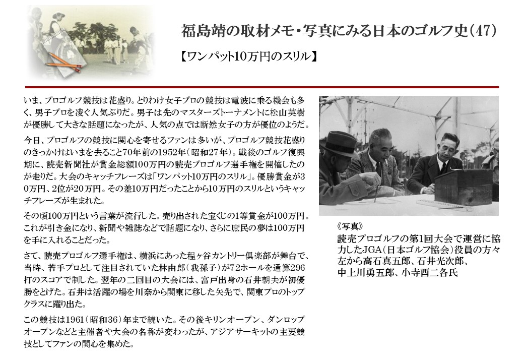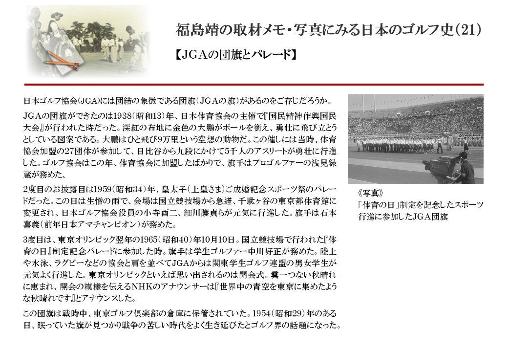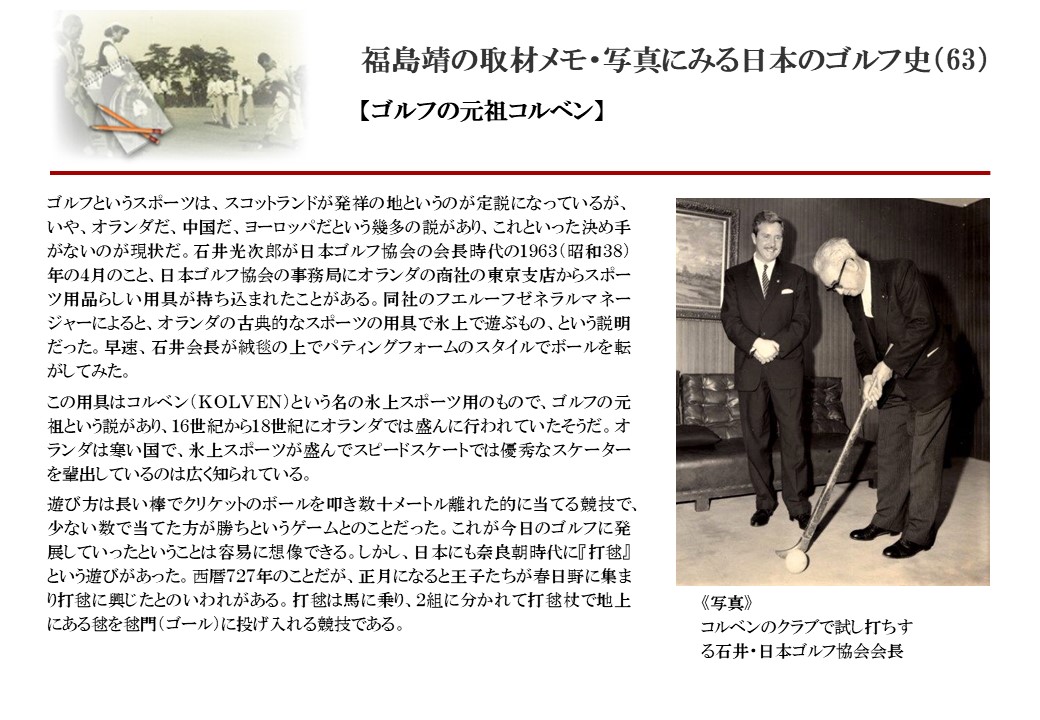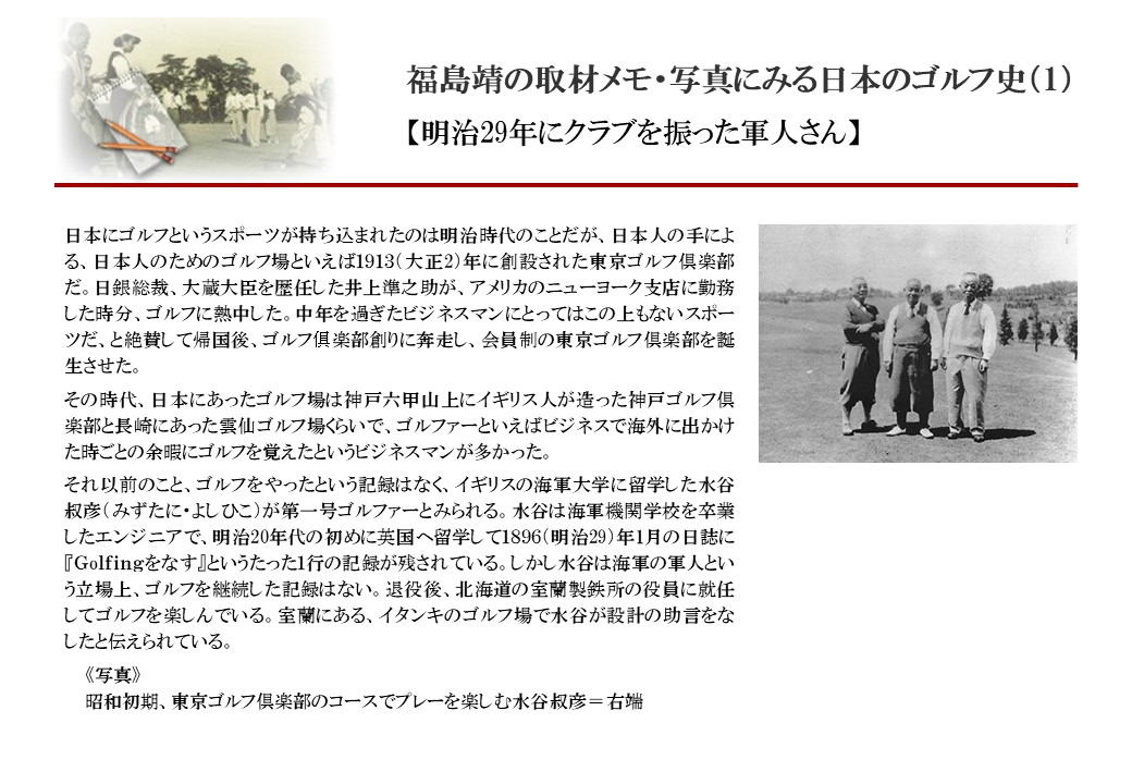 日本に西洋のスポーツ『ゴルフ』が持ち込まれて100年を超えた。 いま、日本国内のゴルフ場数は約2千か所を超え、ゴルフ王国アメリカの1万余に次ぎ、英国や豪州をしのぐ。人口は1千万人といわれた時代があった。ここまで成長した裏には先人たちのゴルフを愛する精神があったからだろう。長年の取材で残ったメモや写真から、ゴルフ振興に取り組んだ人たちの姿を追ってみたい。