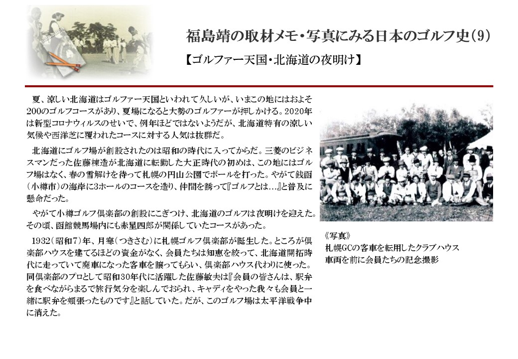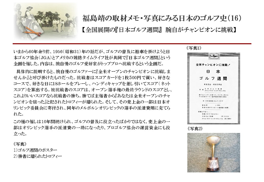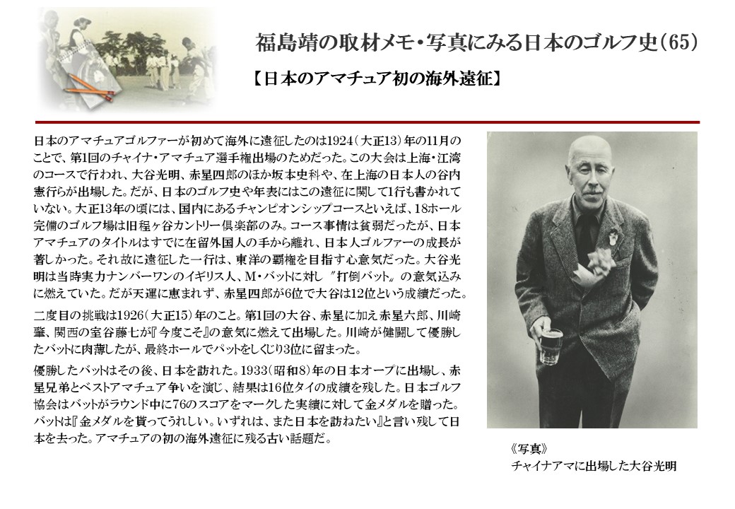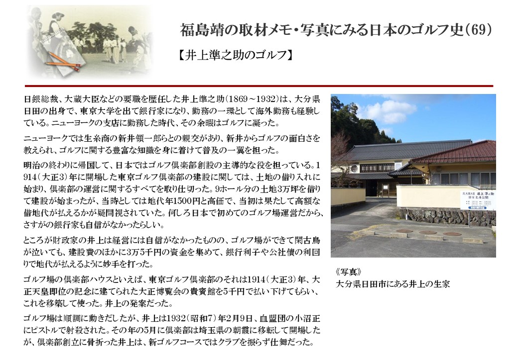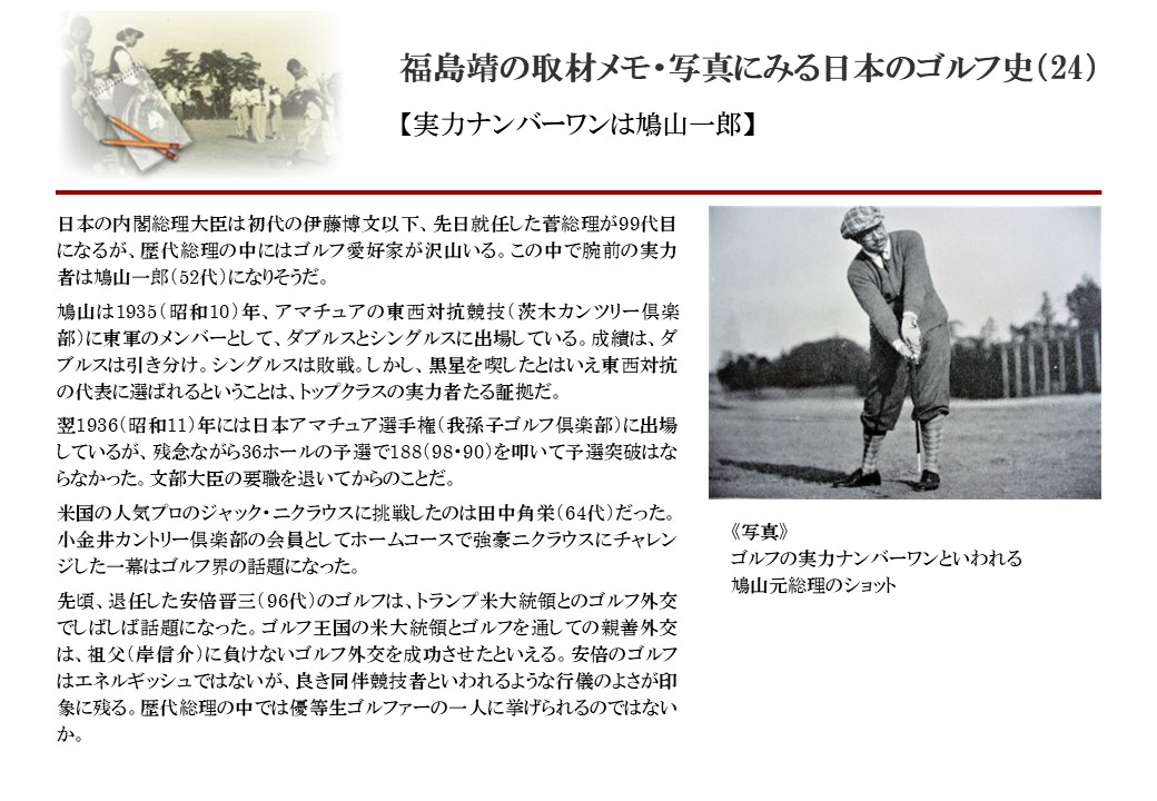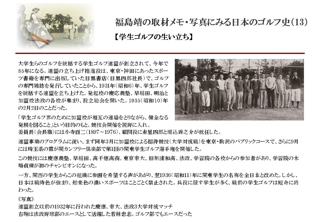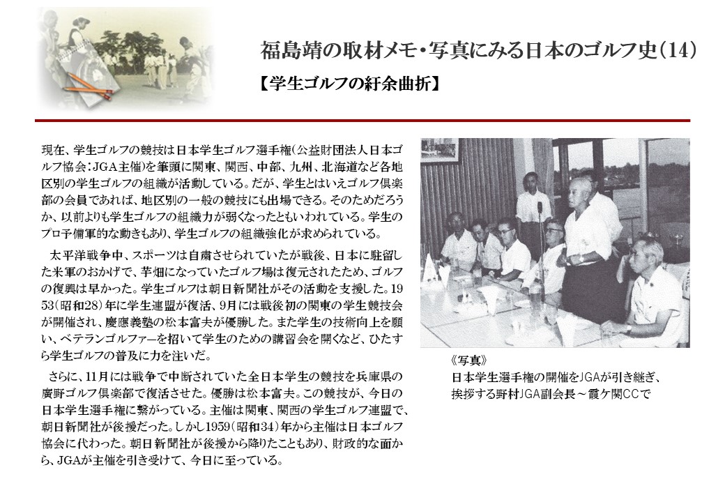 日本に西洋のスポーツ『ゴルフ』が持ち込まれて100年を超えた。 いま、日本国内のゴルフ場数は約2千か所を超え、ゴルフ王国アメリカの1万余に次ぎ、英国や豪州をしのぐ。人口は1千万人といわれた時代があった。ここまで成長した裏には先人たちのゴルフを愛する精神があったからだろう。長年の取材で残ったメモや写真から、ゴルフ振興に取り組んだ人たちの姿を追ってみたい。