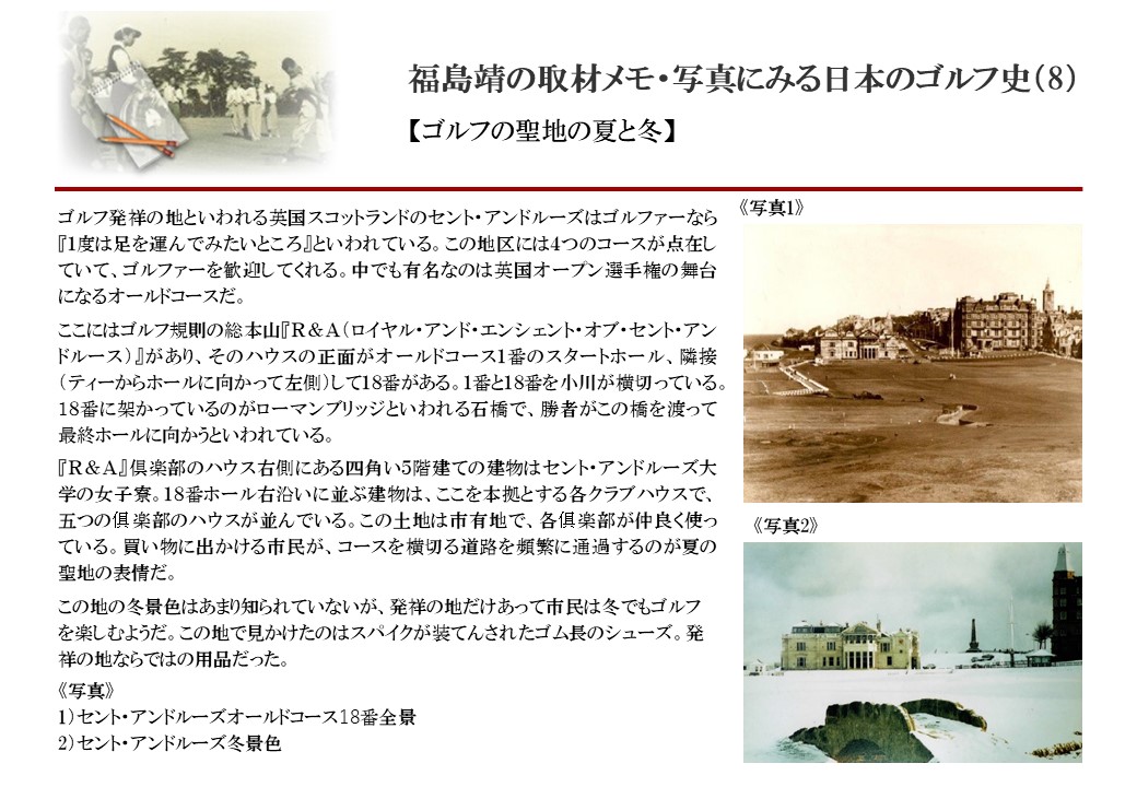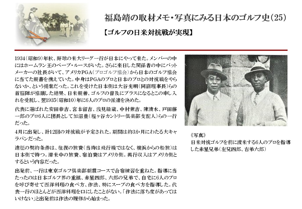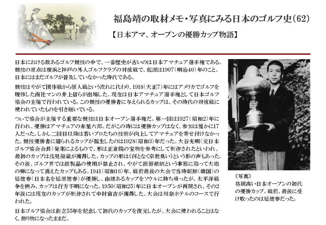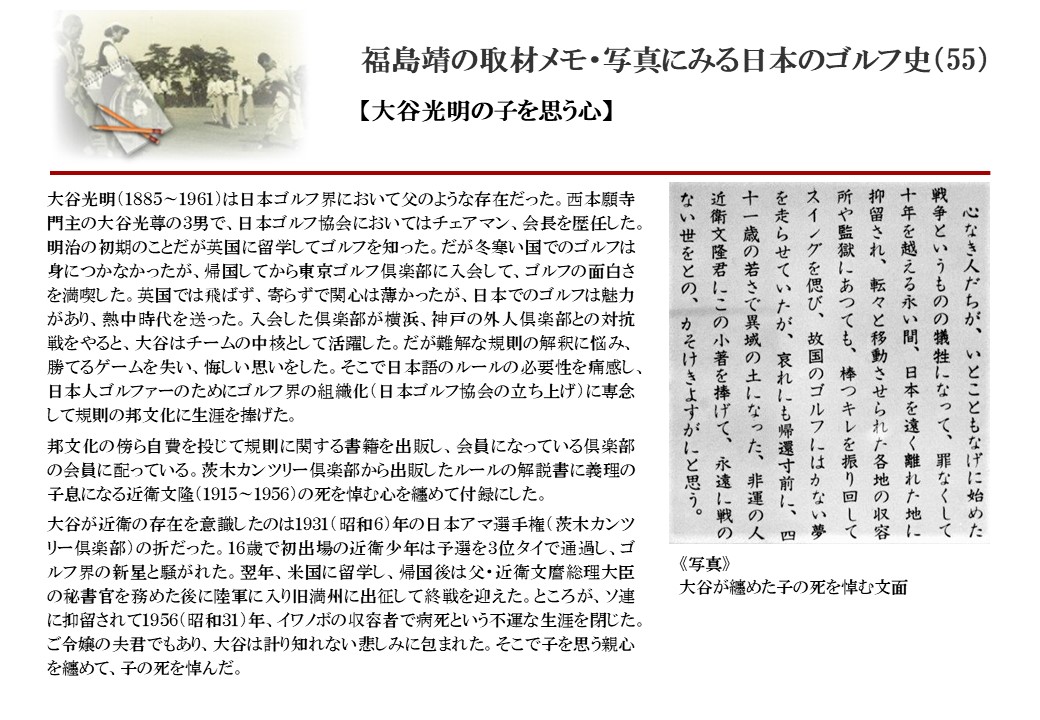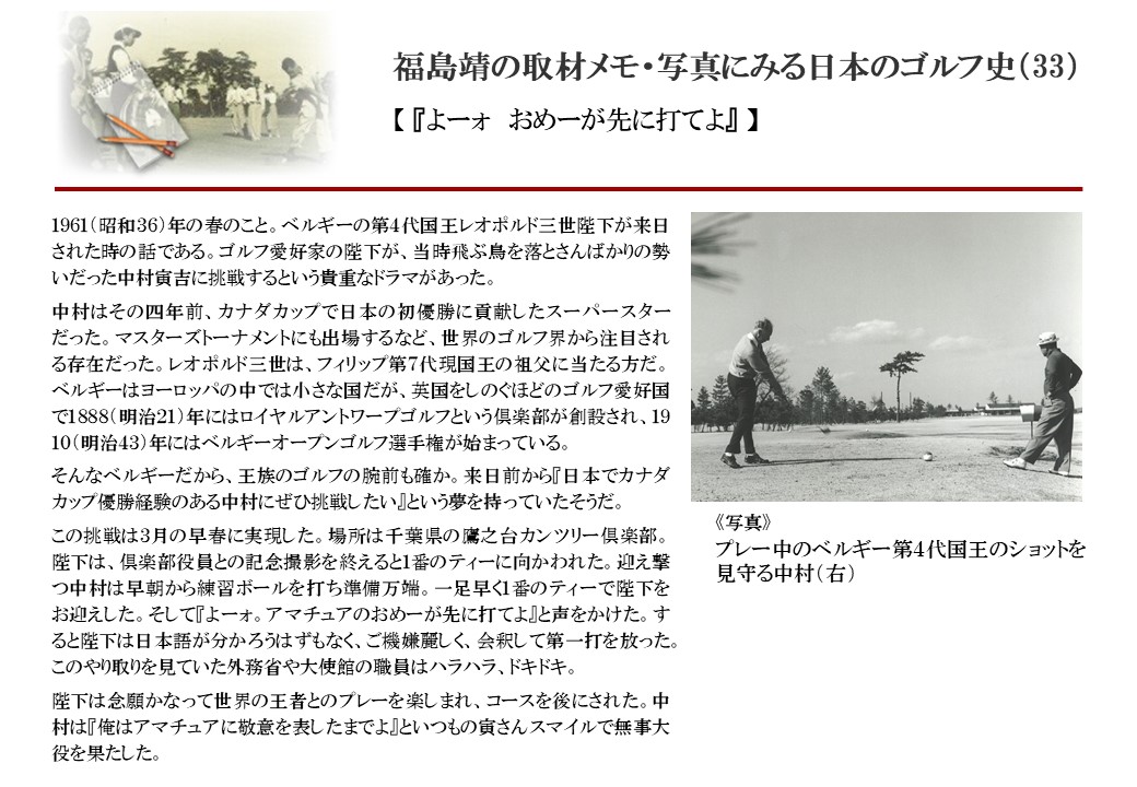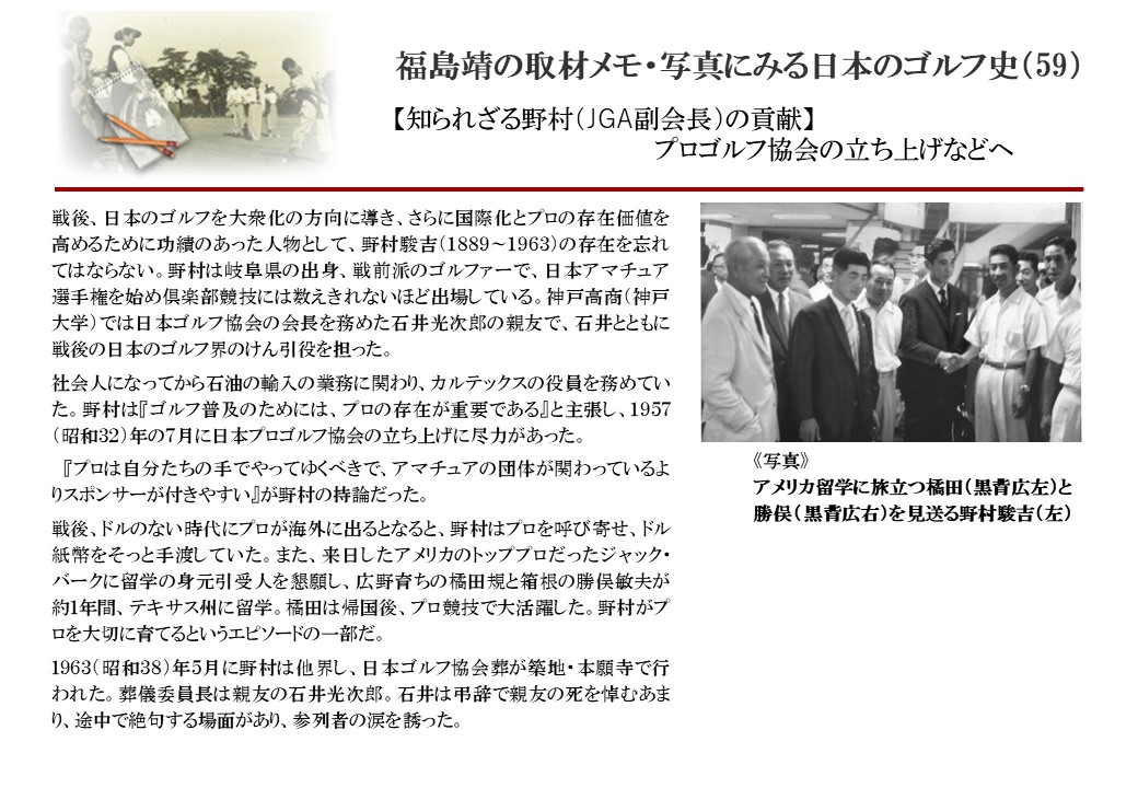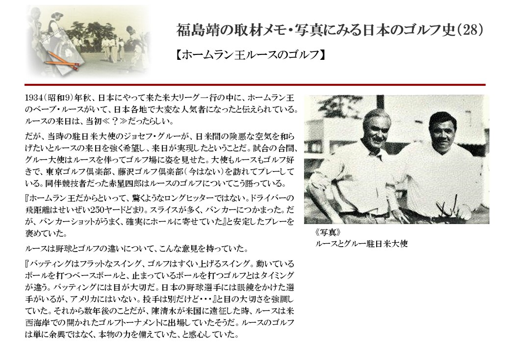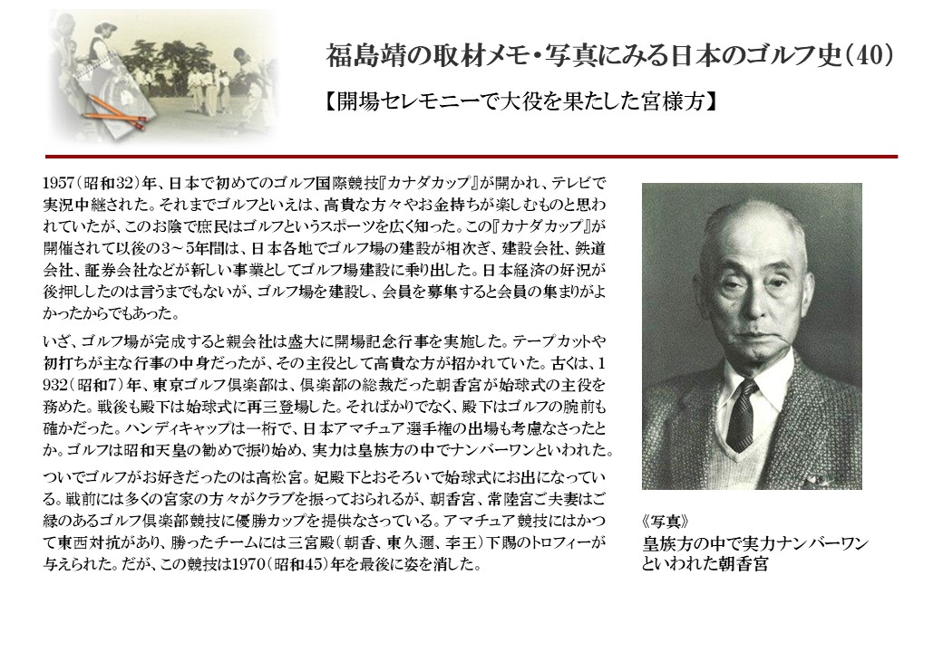 日本に西洋のスポーツ『ゴルフ』が持ち込まれて100年を超えた。 いま、日本国内のゴルフ場数は約2千か所を超え、ゴルフ王国アメリカの1万余に次ぎ、英国や豪州をしのぐ。人口は1千万人といわれた時代があった。ここまで成長した裏には先人たちのゴルフを愛する精神があったからだろう。長年の取材で残ったメモや写真から、ゴルフ振興に取り組んだ人たちの姿を追ってみたい。