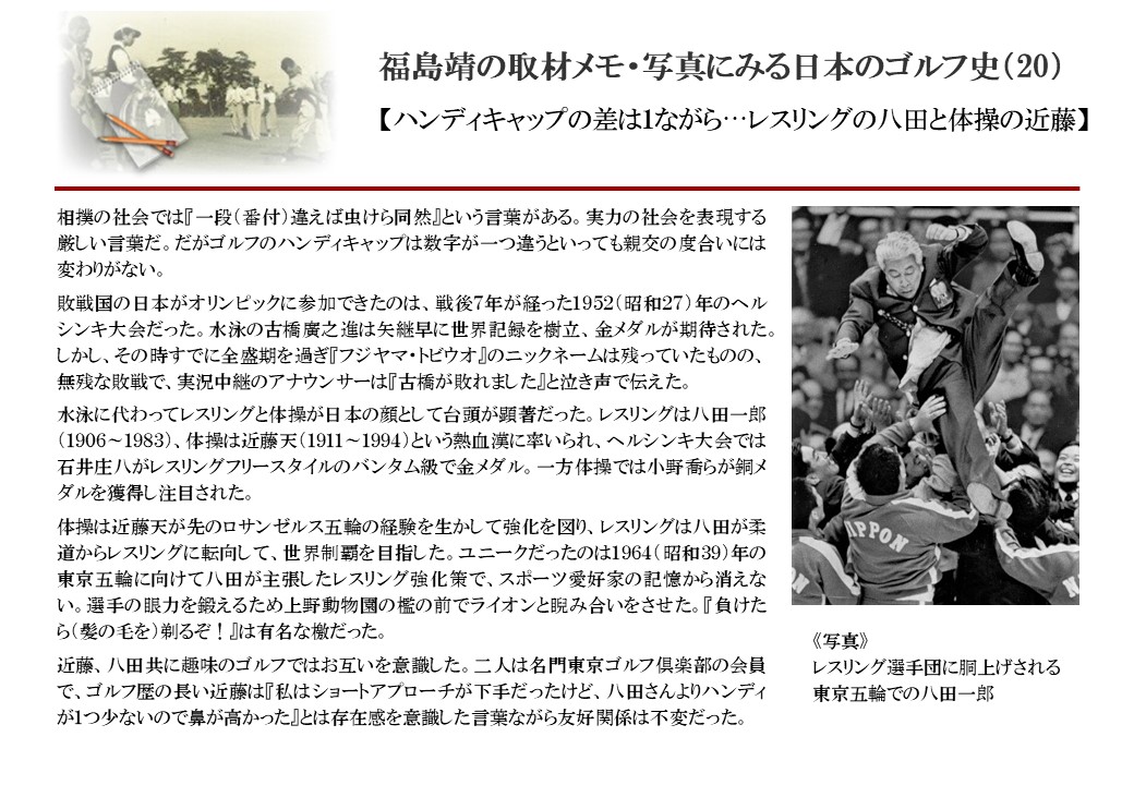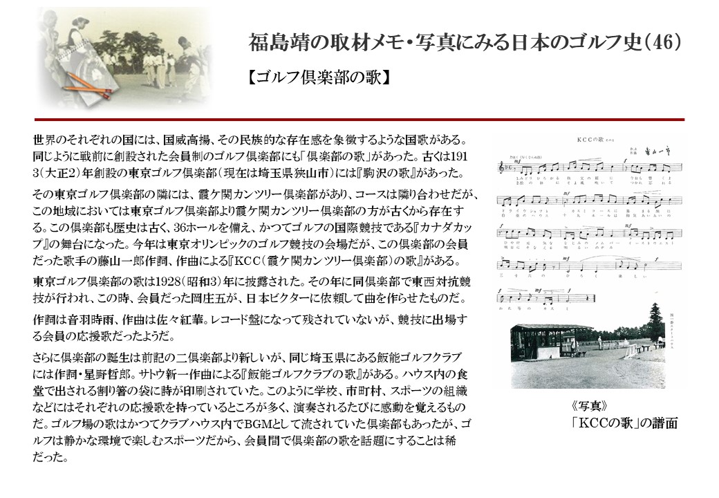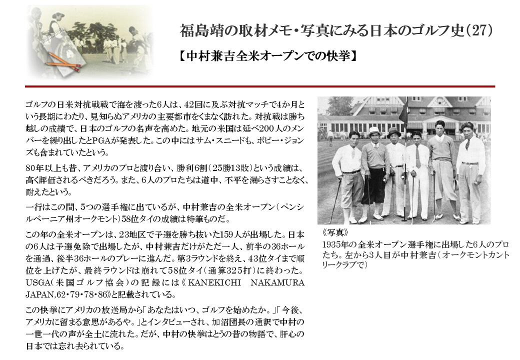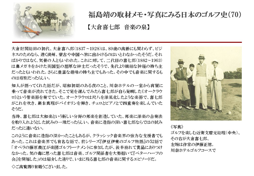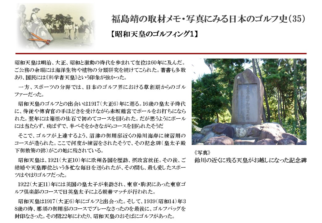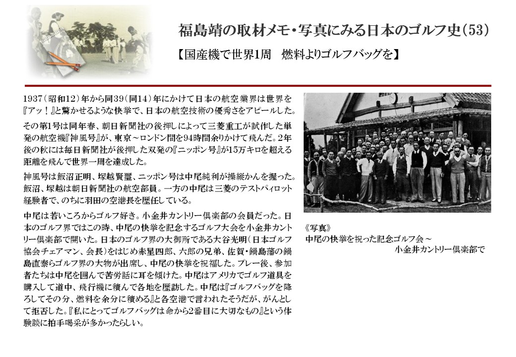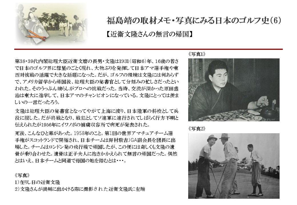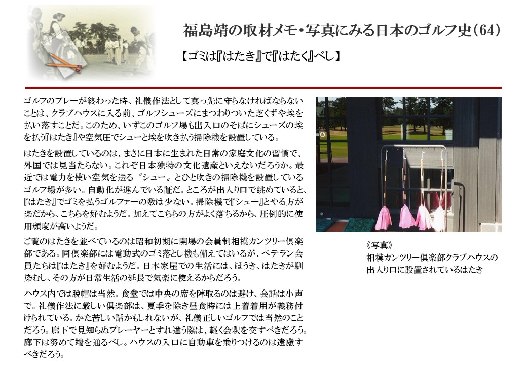 日本に西洋のスポーツ『ゴルフ』が持ち込まれて100年を超えた。 いま、日本国内のゴルフ場数は約2千か所を超え、ゴルフ王国アメリカの1万余に次ぎ、英国や豪州をしのぐ。人口は1千万人といわれた時代があった。ここまで成長した裏には先人たちのゴルフを愛する精神があったからだろう。長年の取材で残ったメモや写真から、ゴルフ振興に取り組んだ人たちの姿を追ってみたい。