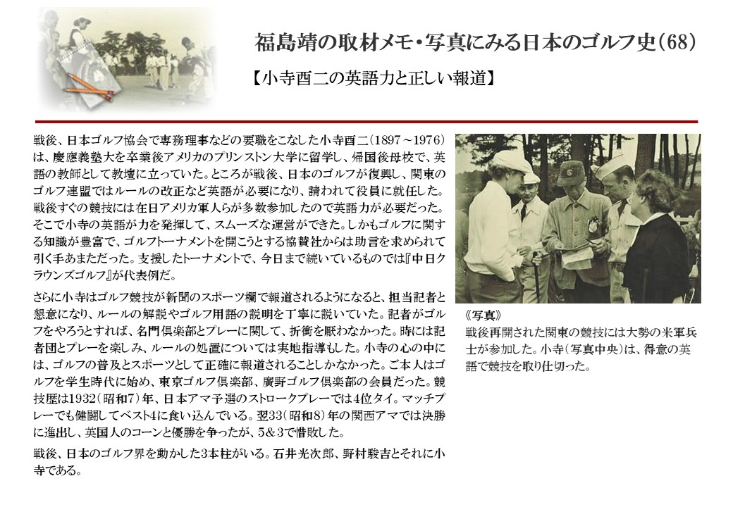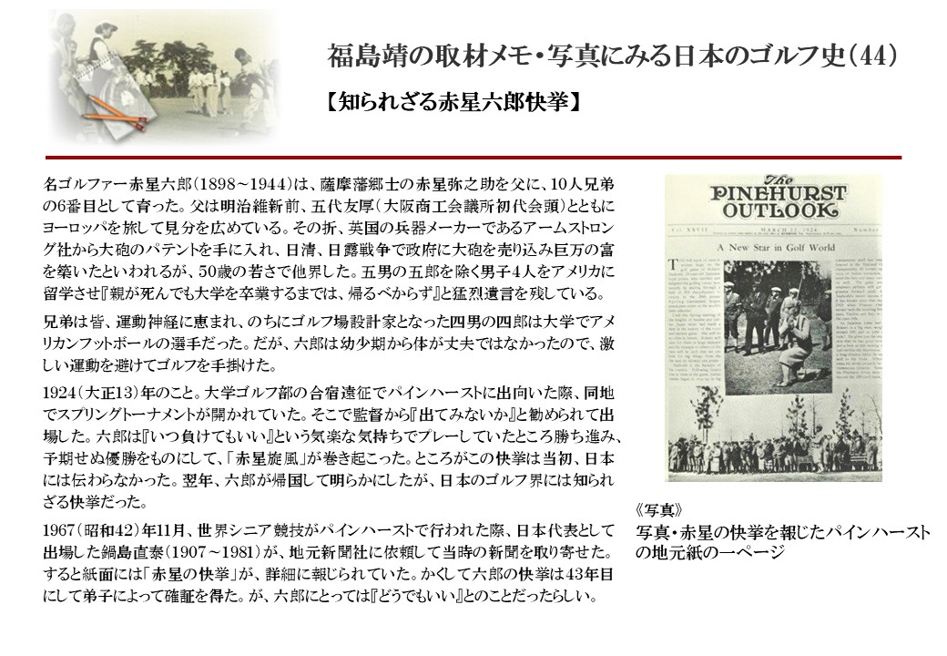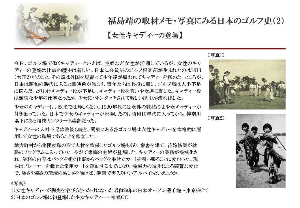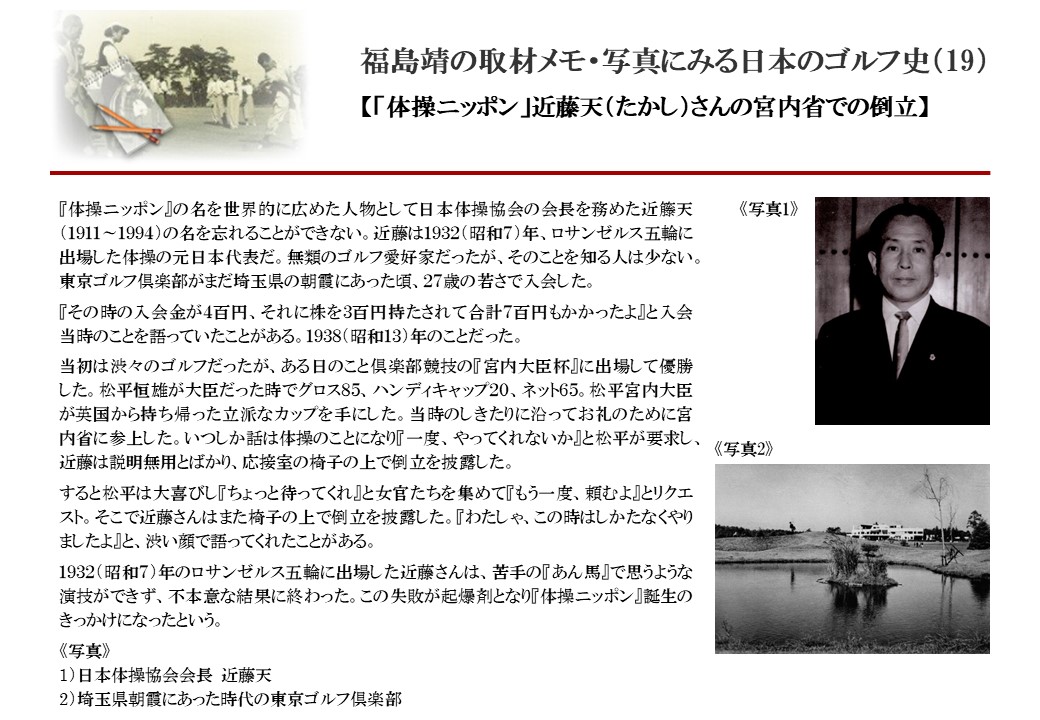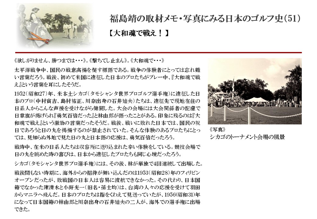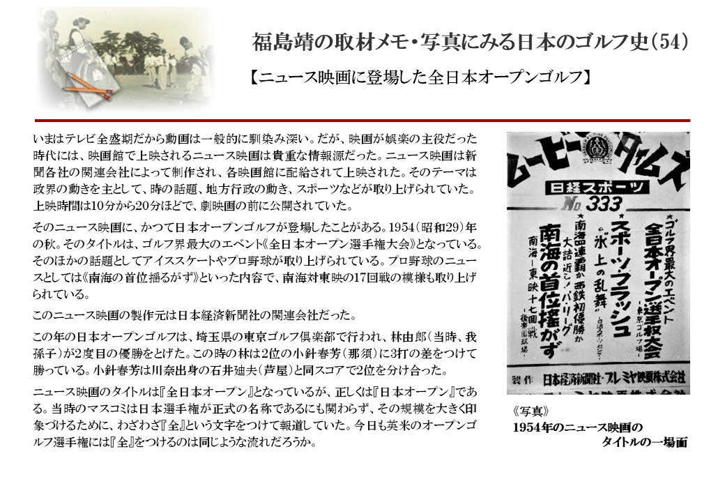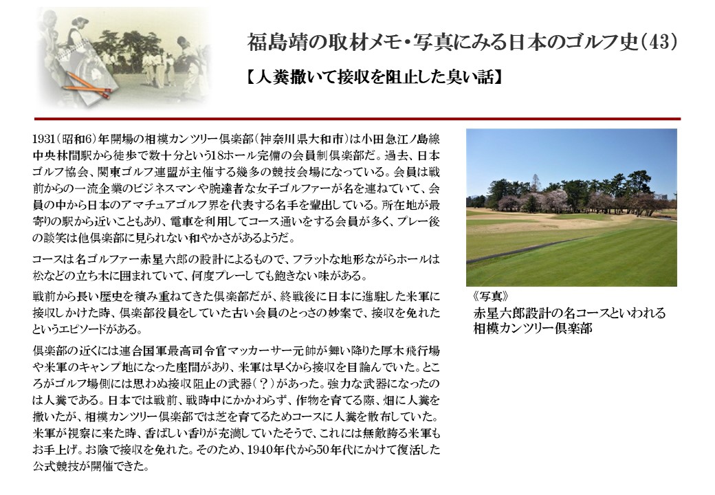 日本に西洋のスポーツ『ゴルフ』が持ち込まれて100年を超えた。 いま、日本国内のゴルフ場数は約2千か所を超え、ゴルフ王国アメリカの1万余に次ぎ、英国や豪州をしのぐ。人口は1千万人といわれた時代があった。ここまで成長した裏には先人たちのゴルフを愛する精神があったからだろう。長年の取材で残ったメモや写真から、ゴルフ振興に取り組んだ人たちの姿を追ってみたい。