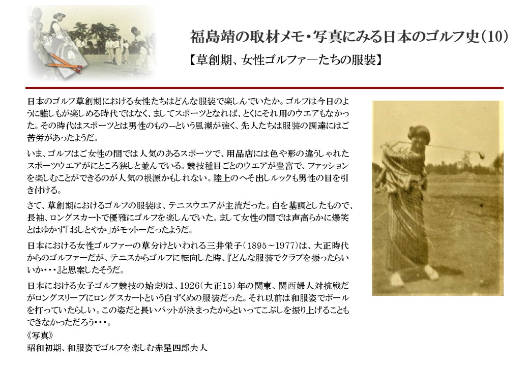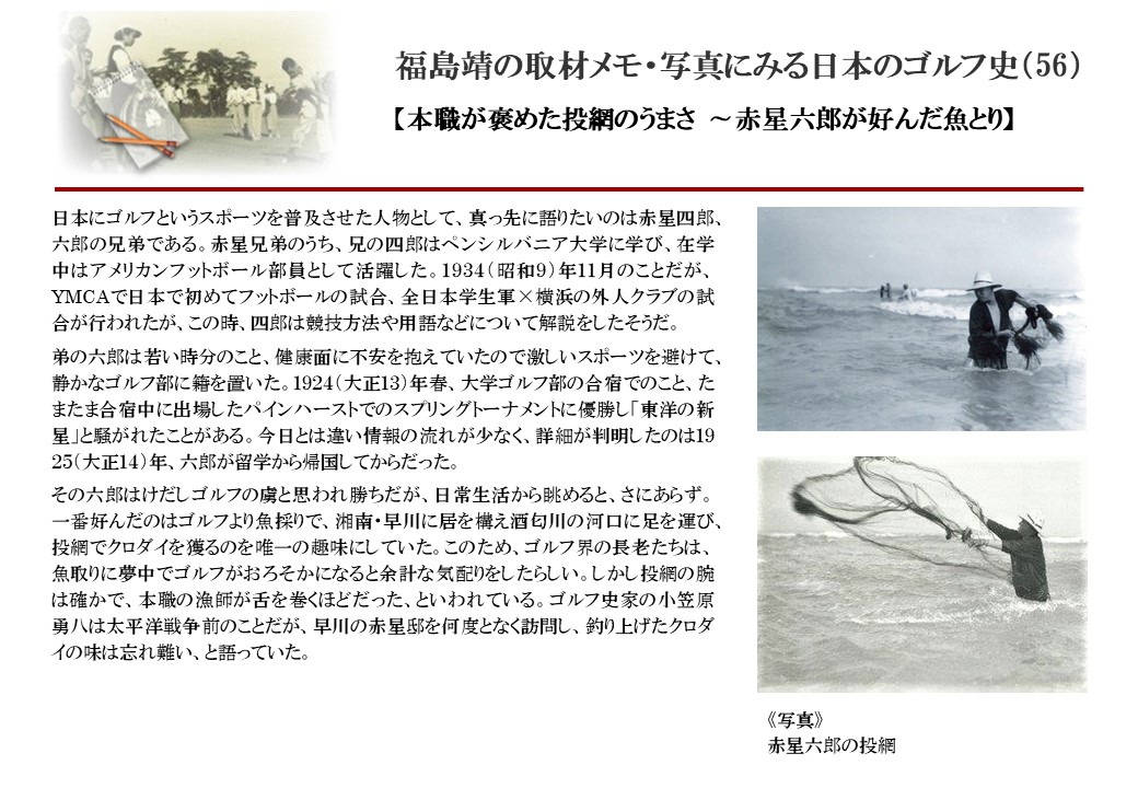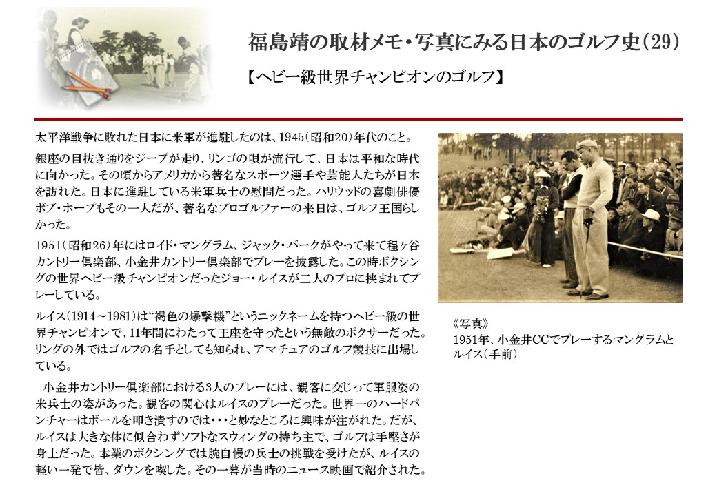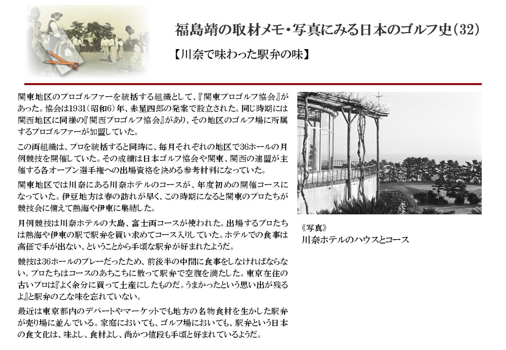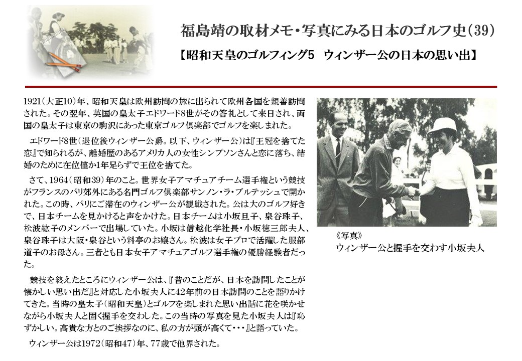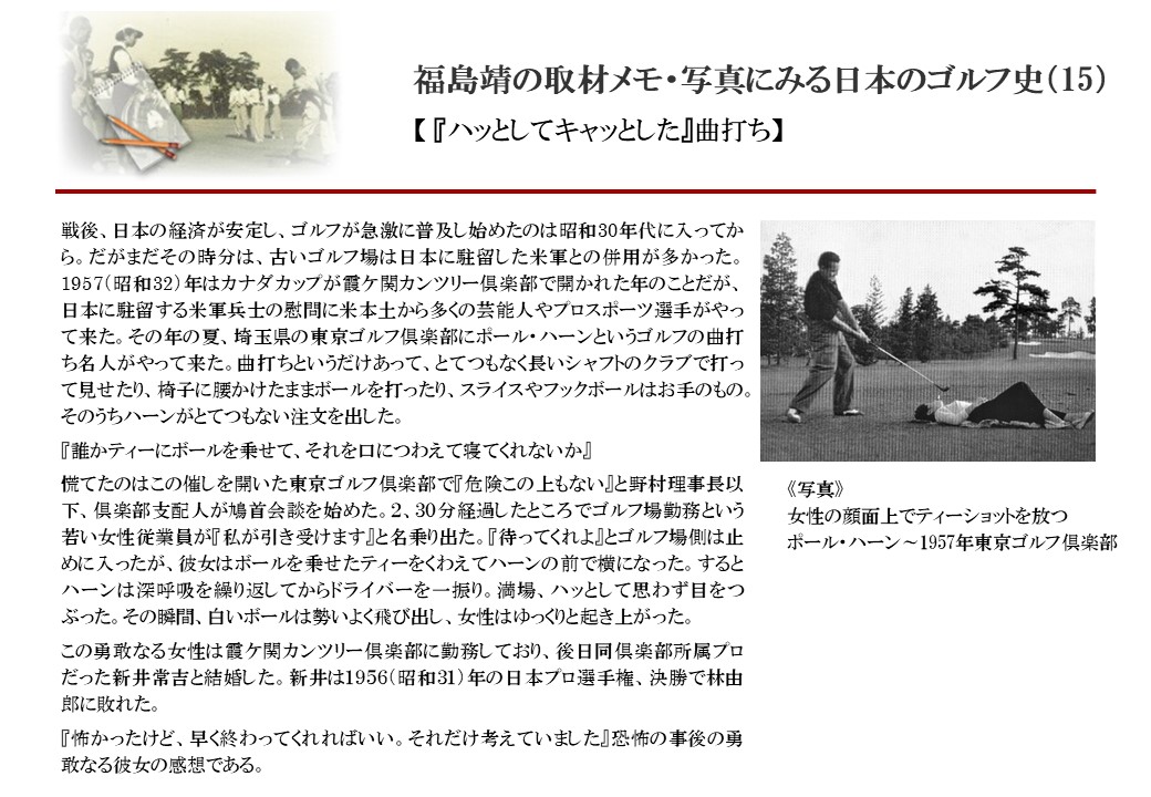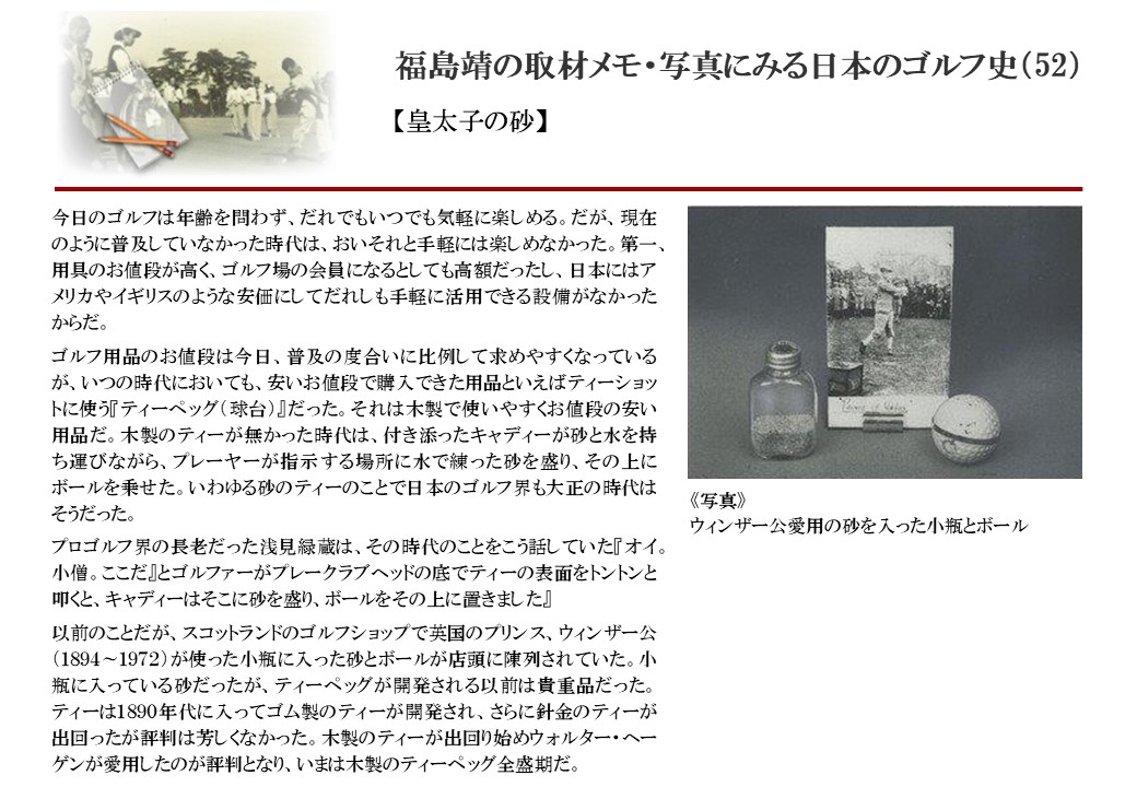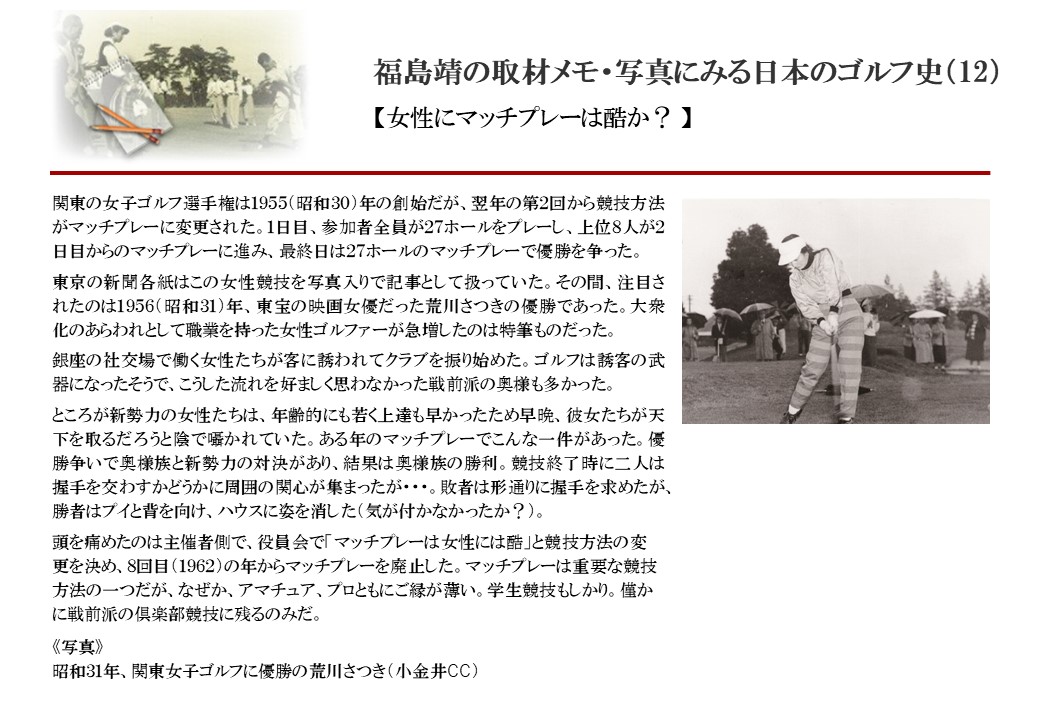 日本に西洋のスポーツ『ゴルフ』が持ち込まれて100年を超えた。 いま、日本国内のゴルフ場数は約2千か所を超え、ゴルフ王国アメリカの1万余に次ぎ、英国や豪州をしのぐ。人口は1千万人といわれた時代があった。ここまで成長した裏には先人たちのゴルフを愛する精神があったからだろう。長年の取材で残ったメモや写真から、ゴルフ振興に取り組んだ人たちの姿を追ってみたい。