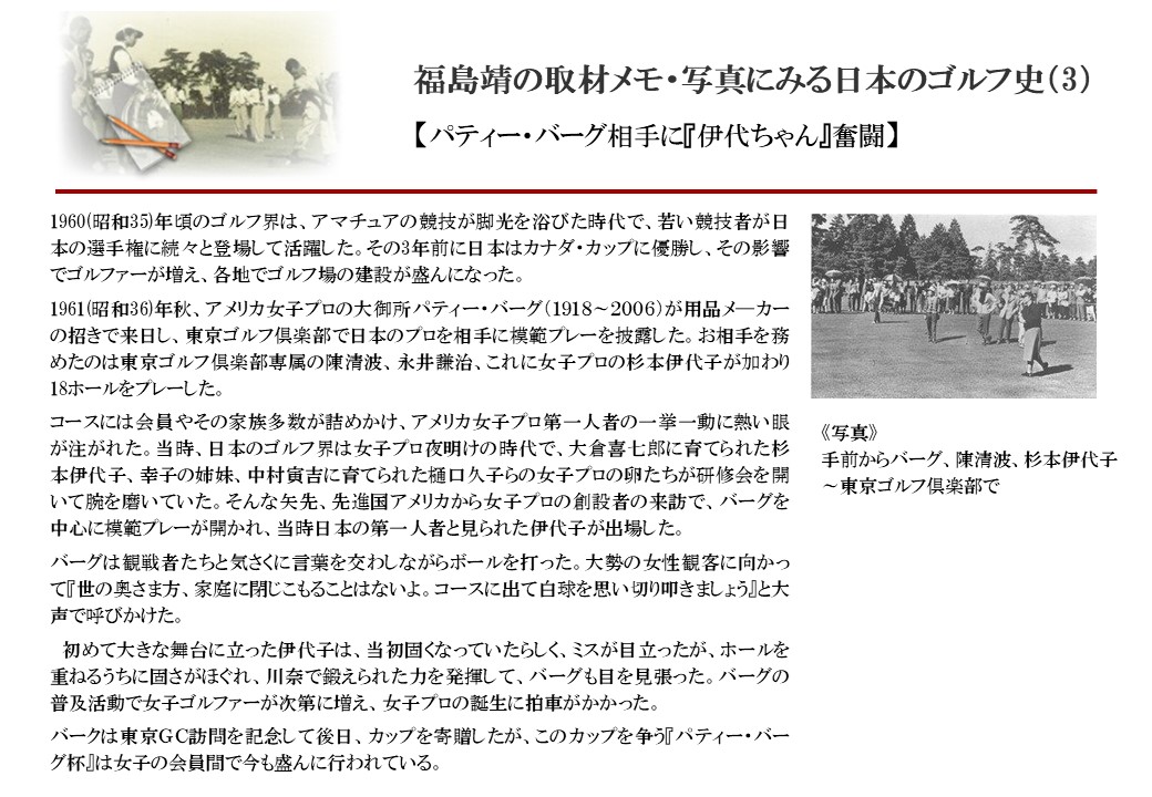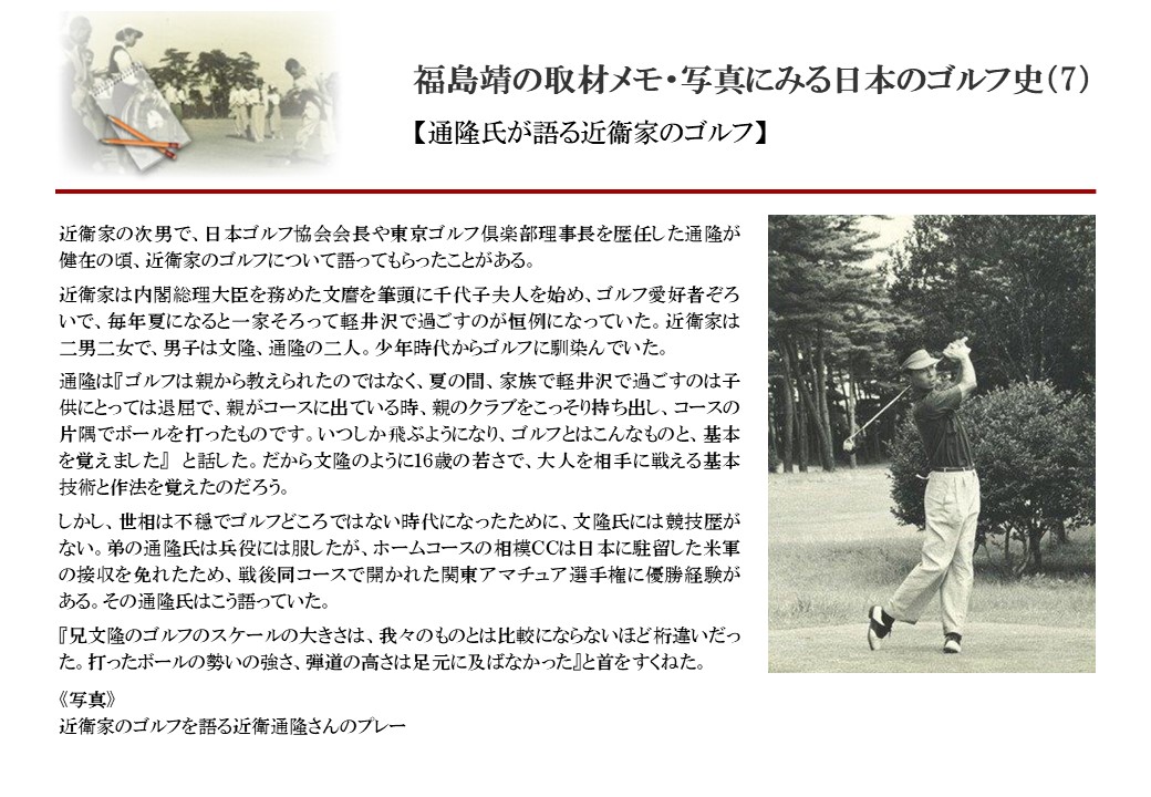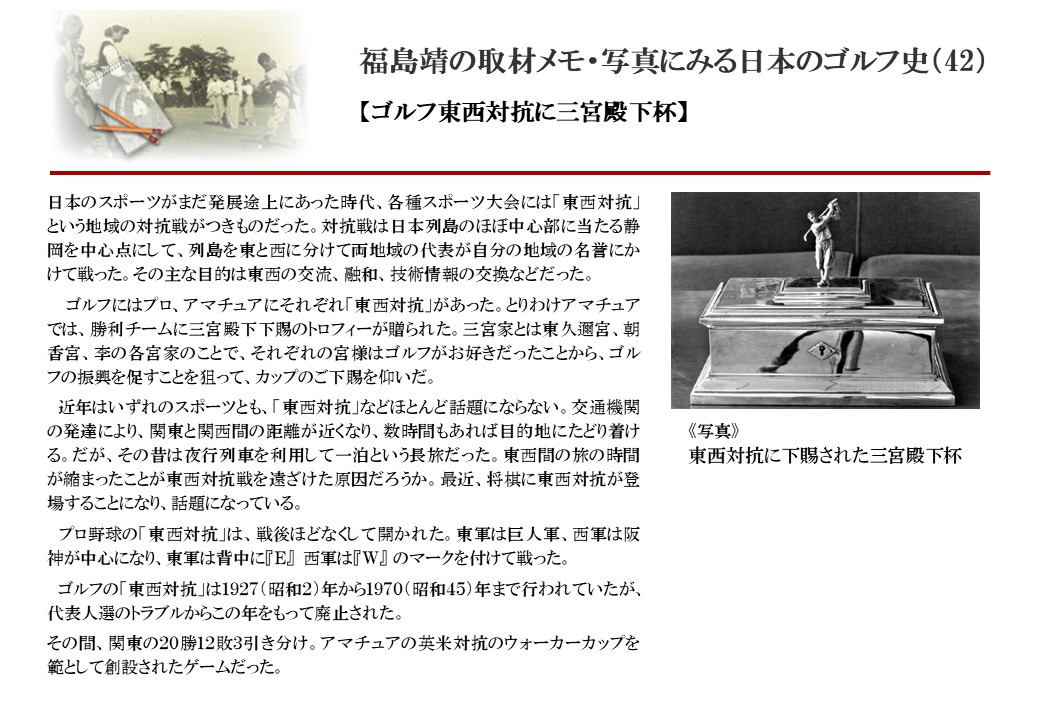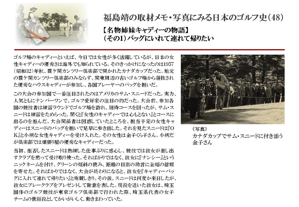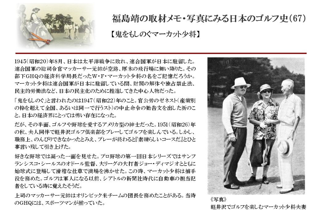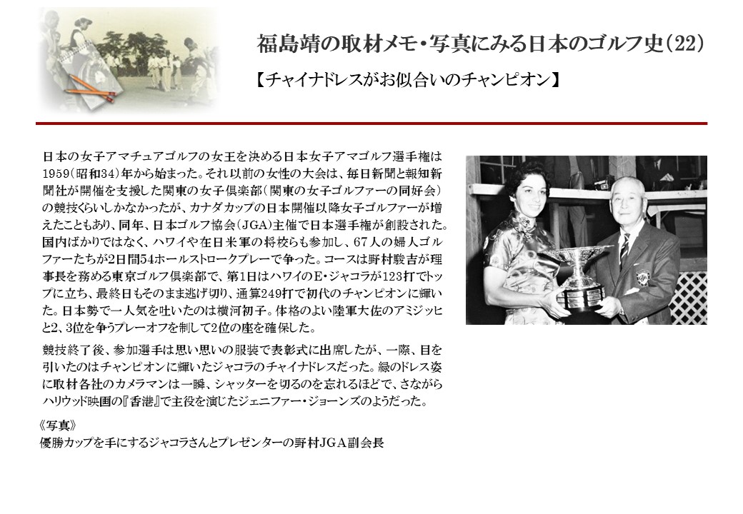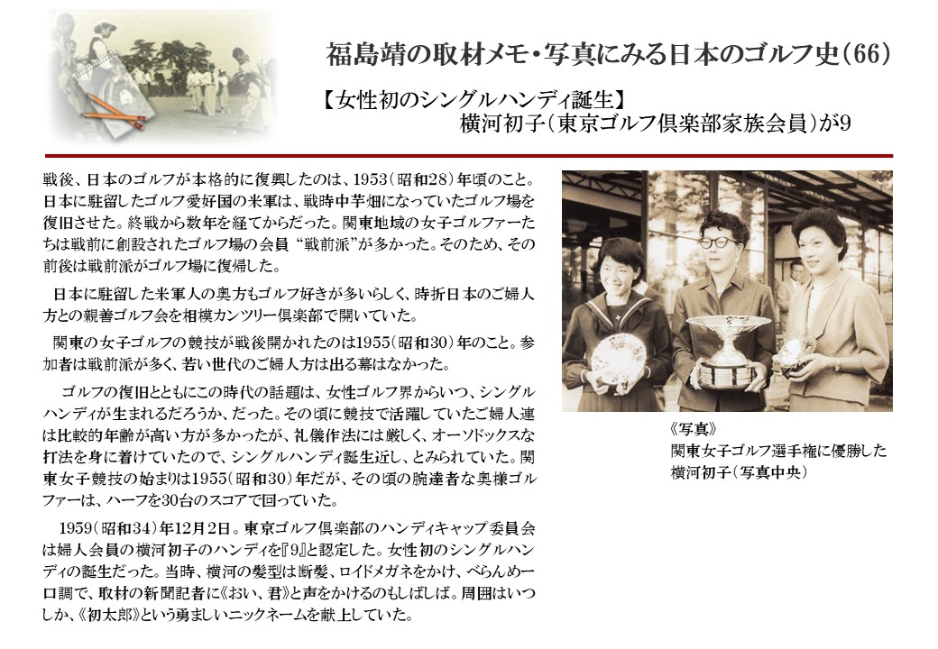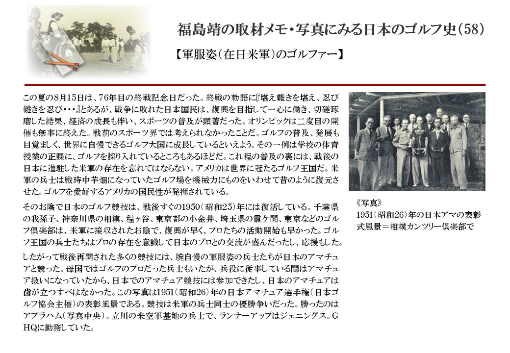日本に西洋のスポーツ『ゴルフ』が持ち込まれて100年を超えた。 いま、日本国内のゴルフ場数は約2千か所を超え、ゴルフ王国アメリカの1万余に次ぎ、英国や豪州をしのぐ。人口は1千万人といわれた時代があった。ここまで成長した裏には先人たちのゴルフを愛する精神があったからだろう。長年の取材で残ったメモや写真から、ゴルフ振興に取り組んだ人たちの姿を追ってみたい。