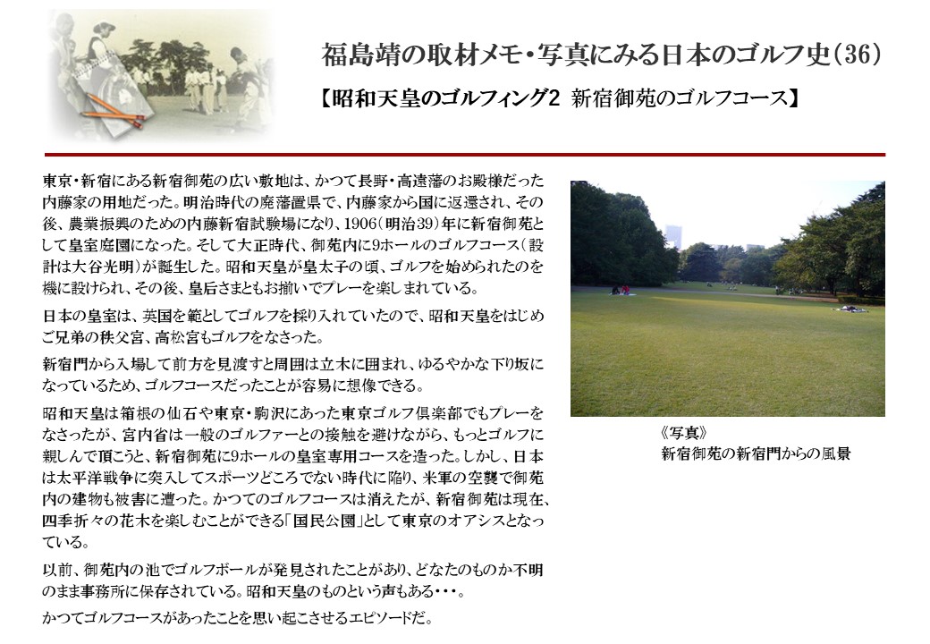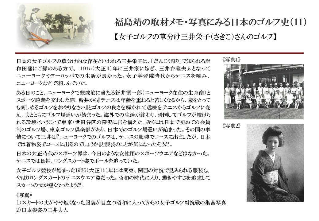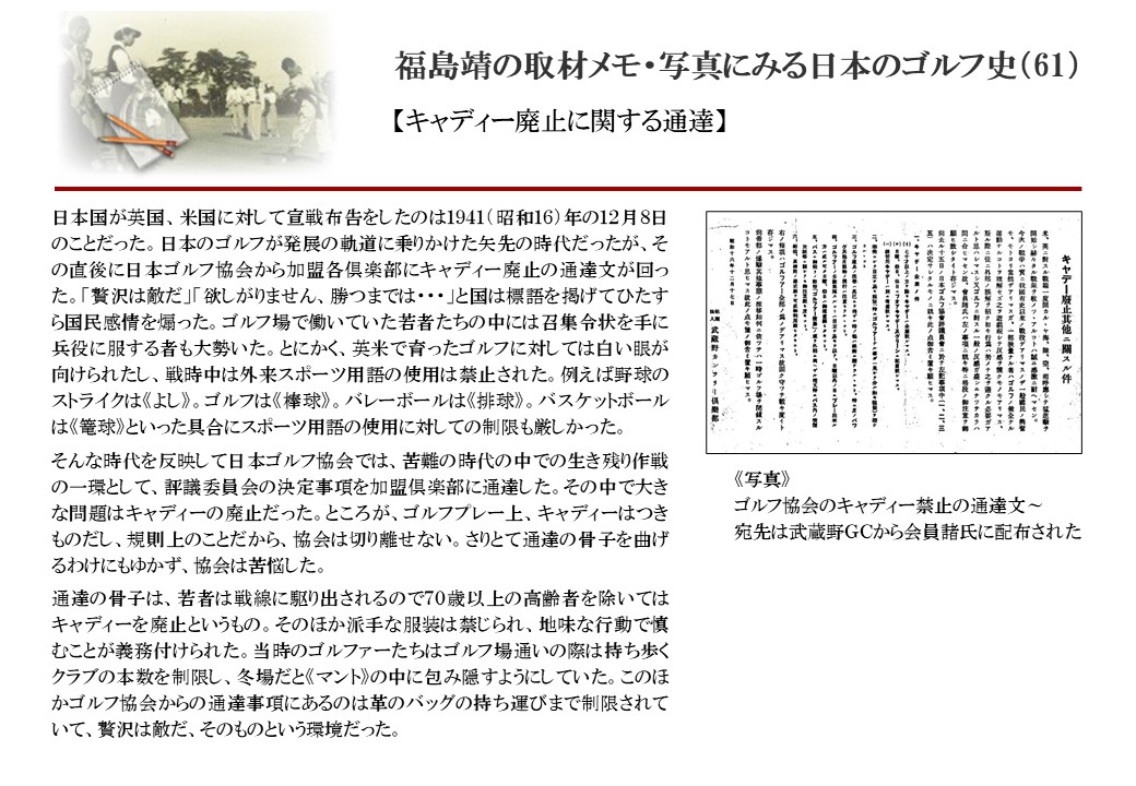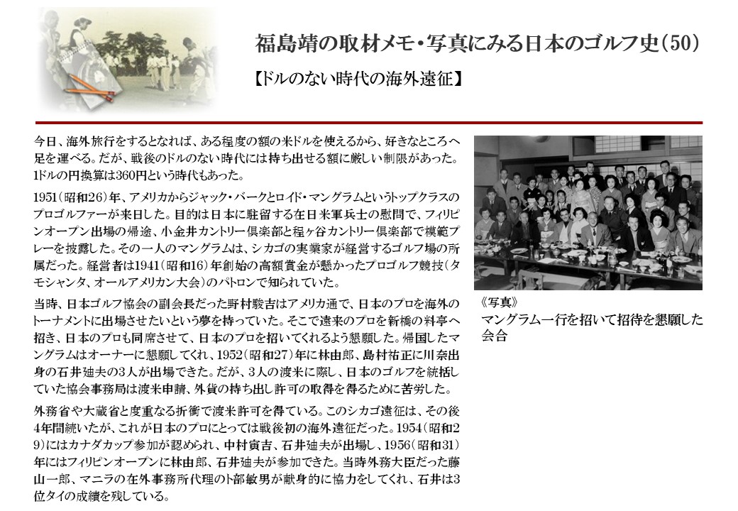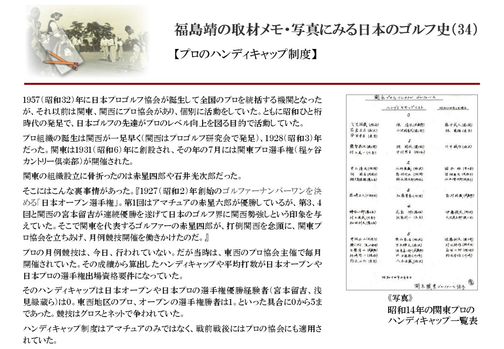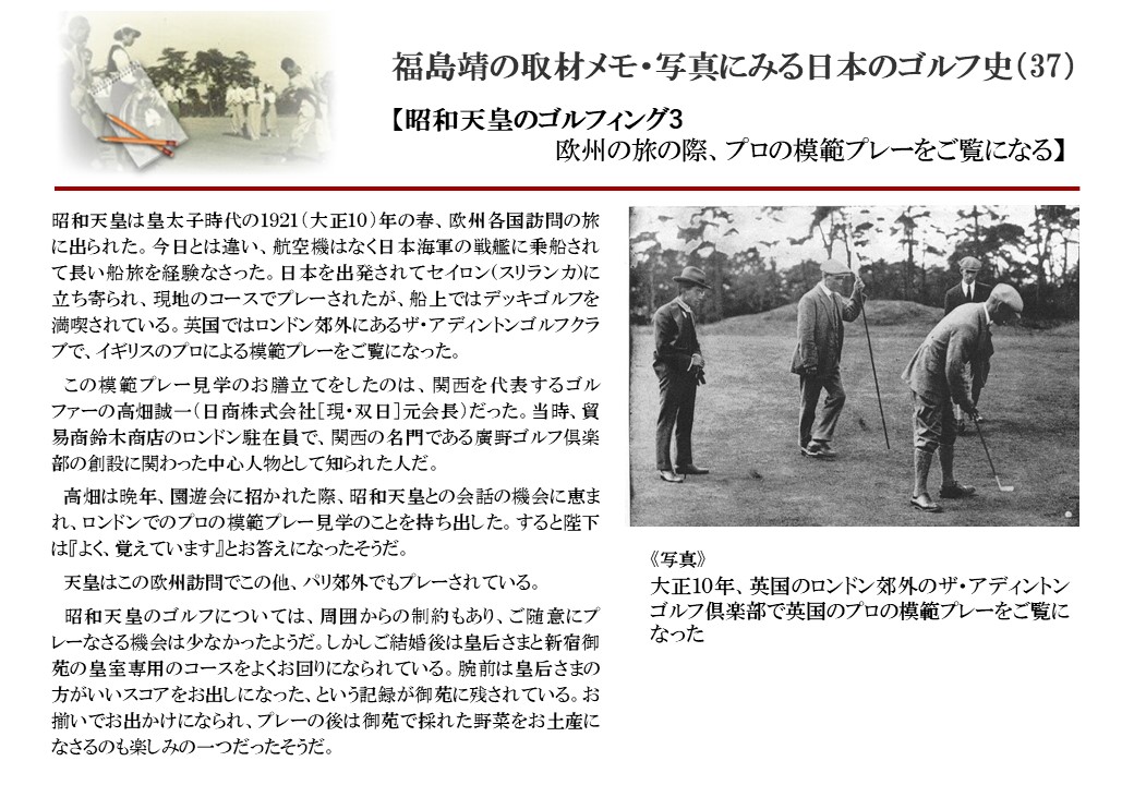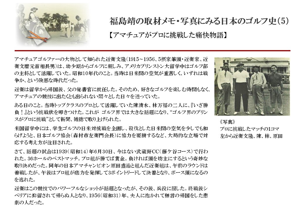日本に西洋のスポーツ『ゴルフ』が持ち込まれて100年を超えた。 いま、日本国内のゴルフ場数は約2千か所を超え、ゴルフ王国アメリカの1万余に次ぎ、英国や豪州をしのぐ。人口は1千万人といわれた時代があった。ここまで成長した裏には先人たちのゴルフを愛する精神があったからだろう。長年の取材で残ったメモや写真から、ゴルフ振興に取り組んだ人たちの姿を追ってみたい。