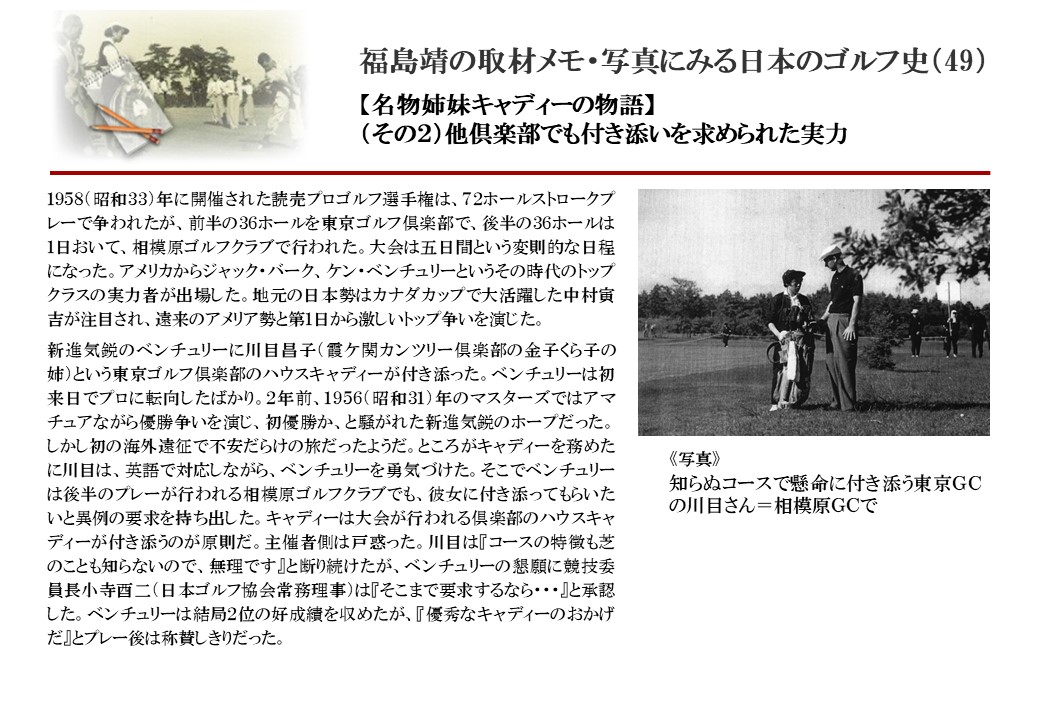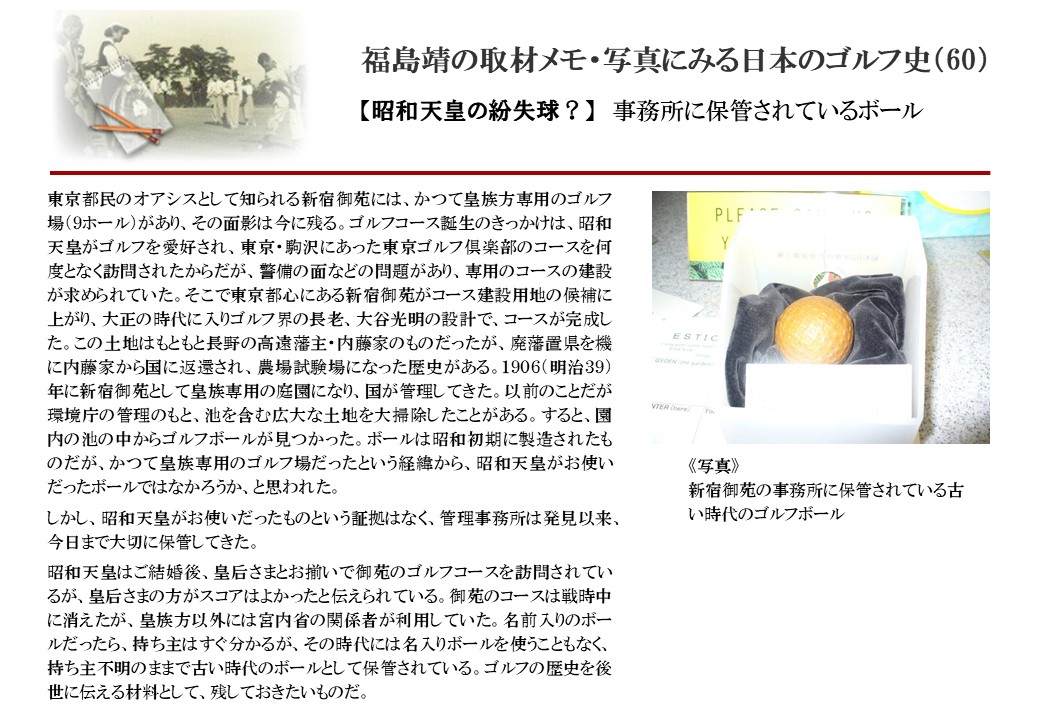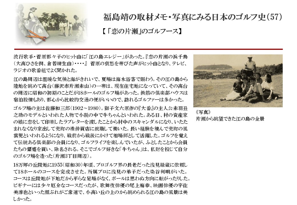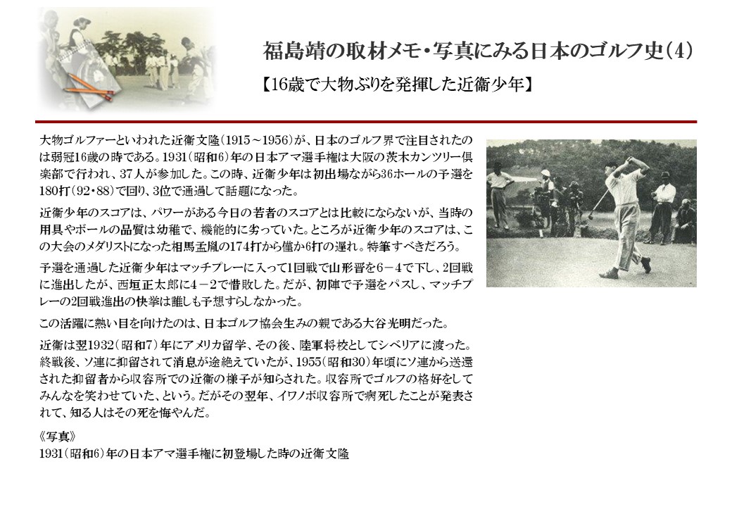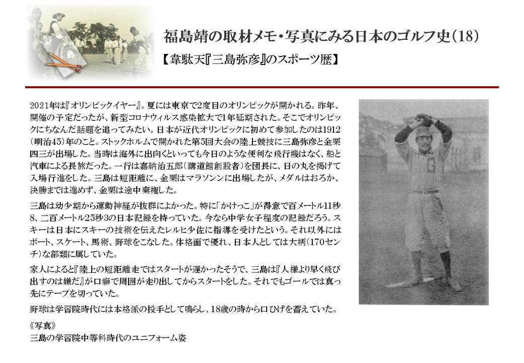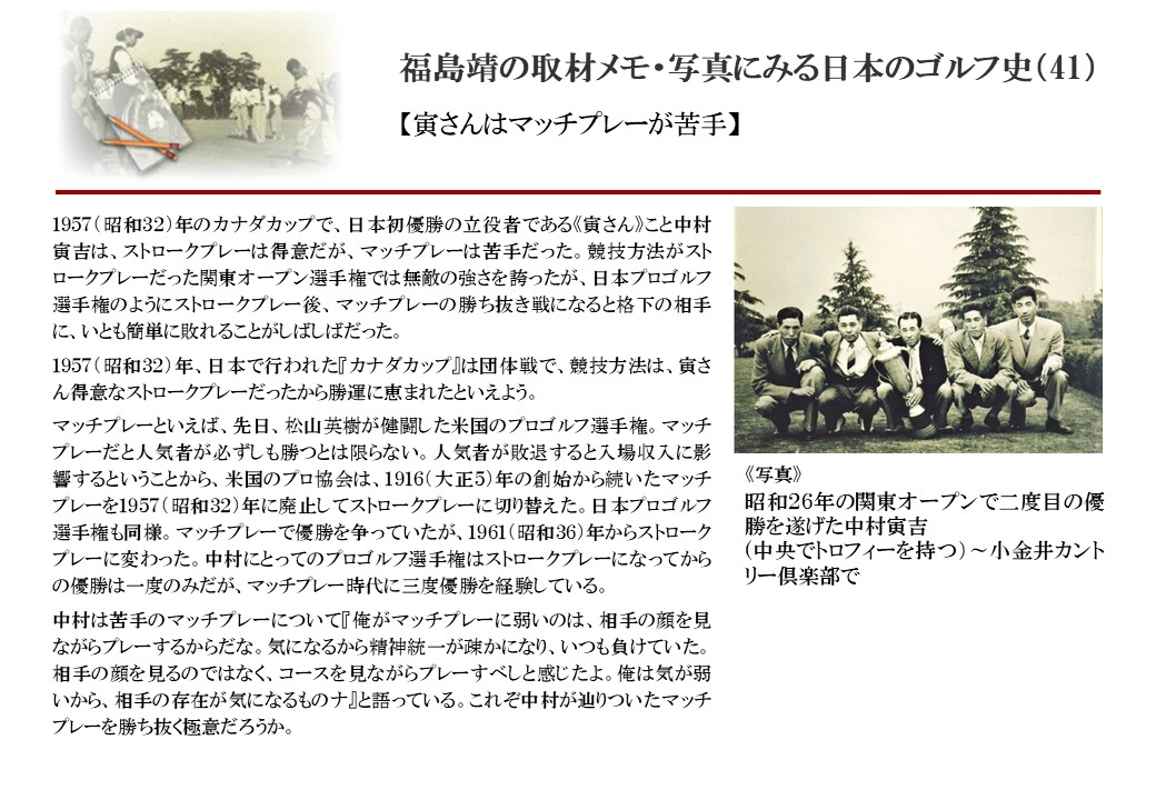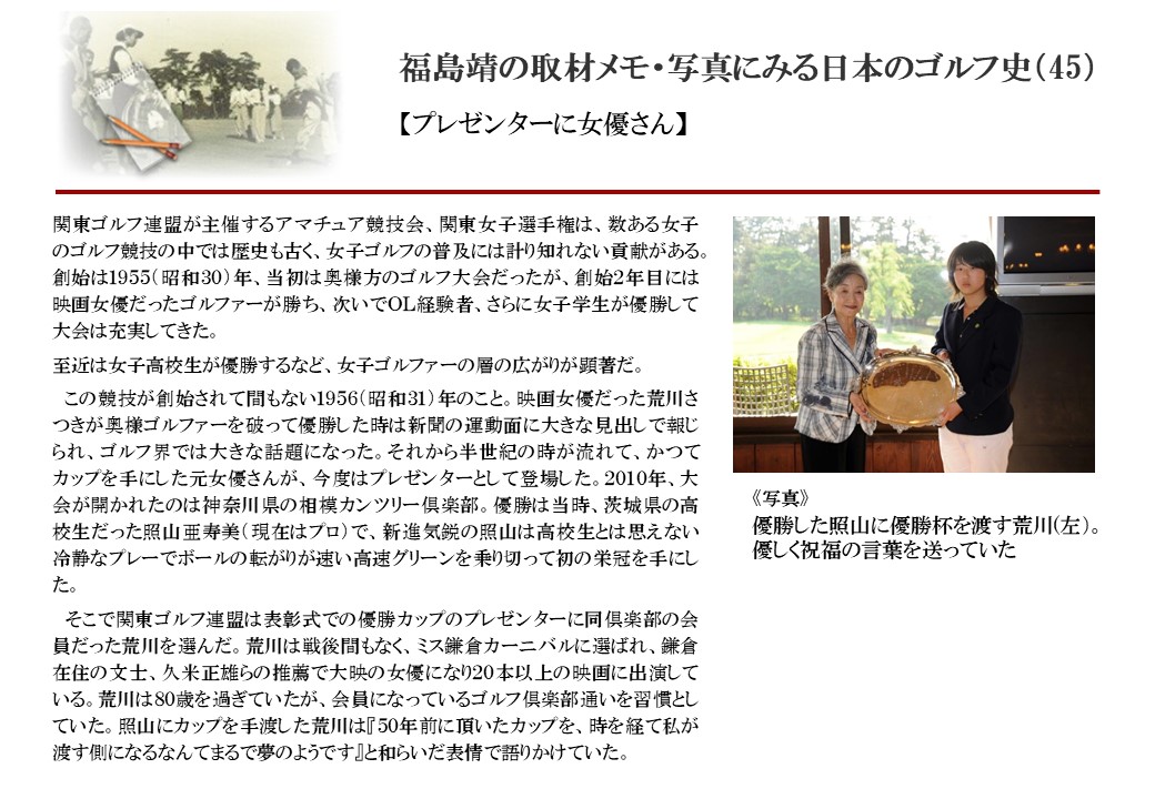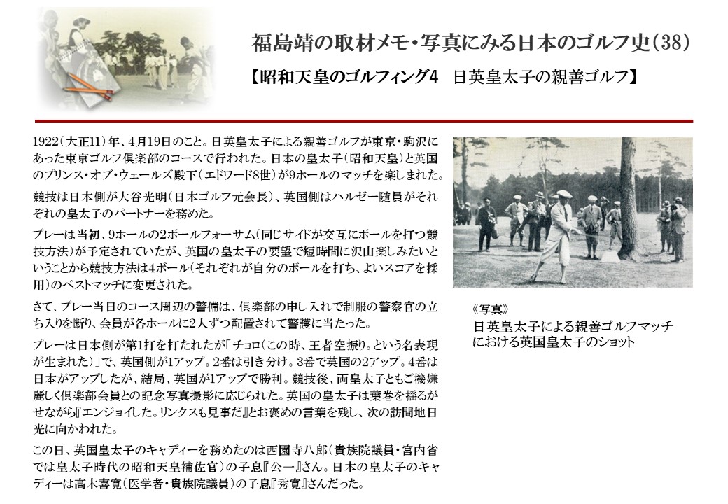 日本に西洋のスポーツ『ゴルフ』が持ち込まれて100年を超えた。 いま、日本国内のゴルフ場数は約2千か所を超え、ゴルフ王国アメリカの1万余に次ぎ、英国や豪州をしのぐ。人口は1千万人といわれた時代があった。ここまで成長した裏には先人たちのゴルフを愛する精神があったからだろう。長年の取材で残ったメモや写真から、ゴルフ振興に取り組んだ人たちの姿を追ってみたい。