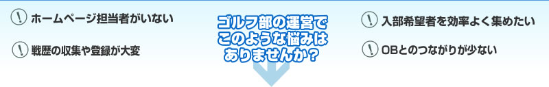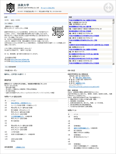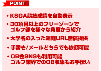 東京システムハウス(株)にて独自に運営する競技結果サイトになります。 サイトのPRを行って行く上で「高校生ゴルファーが進学先の大学の情報を得る場所がなくて悩んでいる」 「各大学での問合せ対応で時間が取られている」という状況を知り、競技結果だけでなく各大学ゴルフ部の情報を提供開始する運びになりました。 是非ともご協力いただけるとありがたいです。よろしくお願いいたします。 |